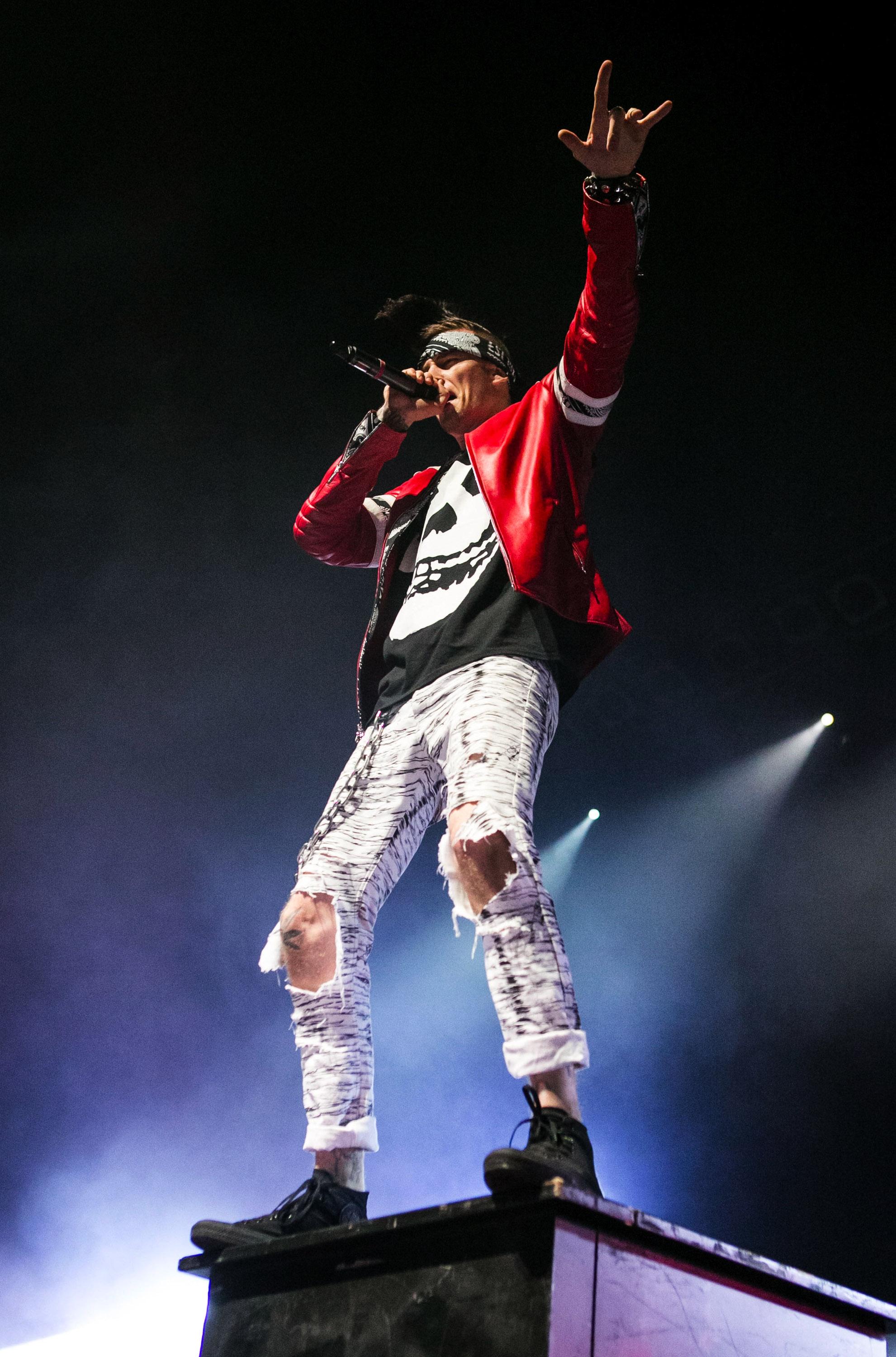 Для выступлений — дерзко, для ковровых дорожек — сдержанно. Вот такой девиз у Machine Gun Kelly! Рокер точно знает, как произвести фурор на сцене: байкерские куртки, большие цепи, футболки с черепами и ирокез. Или, например, полностью черный образ вроде футболки, скинни-джинсов, ботинок Dr.Martens и акцентной шляпы для мероприятий!