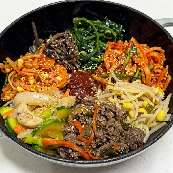 Традиционно блюдо содержит смесь ростков фасоли, шпината, яиц, говядины, моркови, кабачков, огурцов, грибов и других овощей. Привычный нам концепт солянки, но не супа 😅