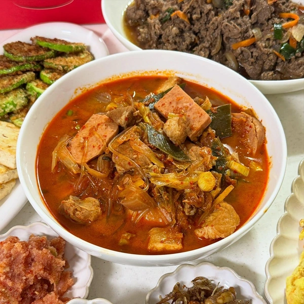 Наваристый суп с кимчи (очень популярной капусты в Корее) с добавлением зеленого лука, чеснока, тофу, грибов и большого количества красного перца чили. Также считается традиционным и широко распространено.