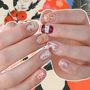 Нежный блестящий маникюр с игрушками и пряниками понравится тем, кто не хочет носить яркие ногти