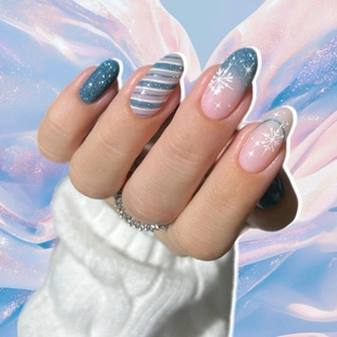 Блестящий маникюр в голубом оттенке со снежинками и френчем добавит в твой образ свежести, сияния и чуть-чуть новогодней магии