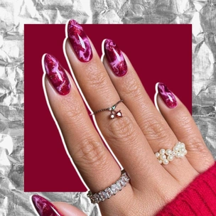 Белые разводы на красном фоне с глиттером выглядят просто невероятно! Давай повторять этот дизайн ногтей 💅