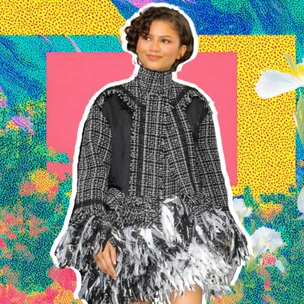 Вместо свадебной эстетики, которой был пропитан промо-тур фильма «Вот это драма!», Зендея неожиданно сделала ставку на богемную элегантность с нотками стритвира, выбрав твидовый жакет в стиле пэчворк и юбку с рваной бахромой 😎