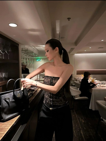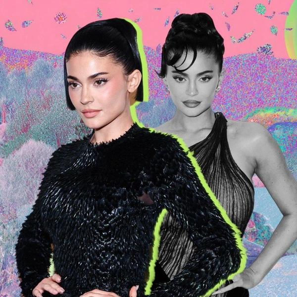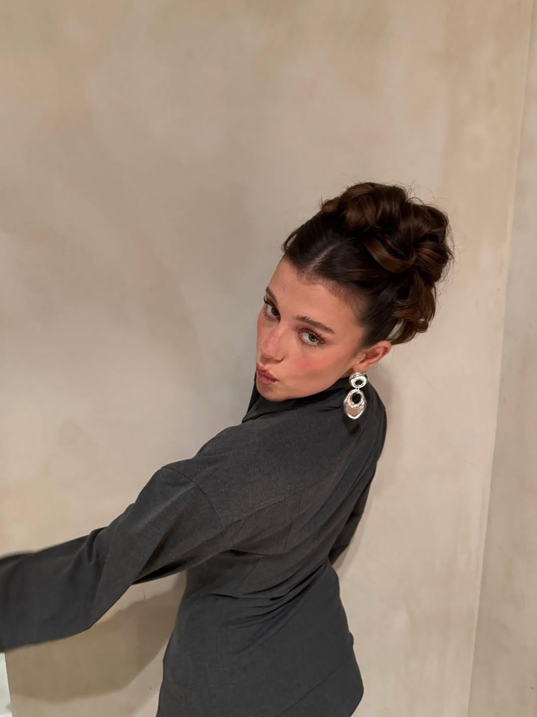 Это объемный пучок, высоко зафиксированный на затылке и украшенный несколькими мягкими прядями у лица, которые деликатно его обрамляют. Чтобы повторить, сделай высокий хвост, слегка начеши его у основания для объема, затем небрежно сверни в пучок и закрепи шпильками, выпустив пару прядей.