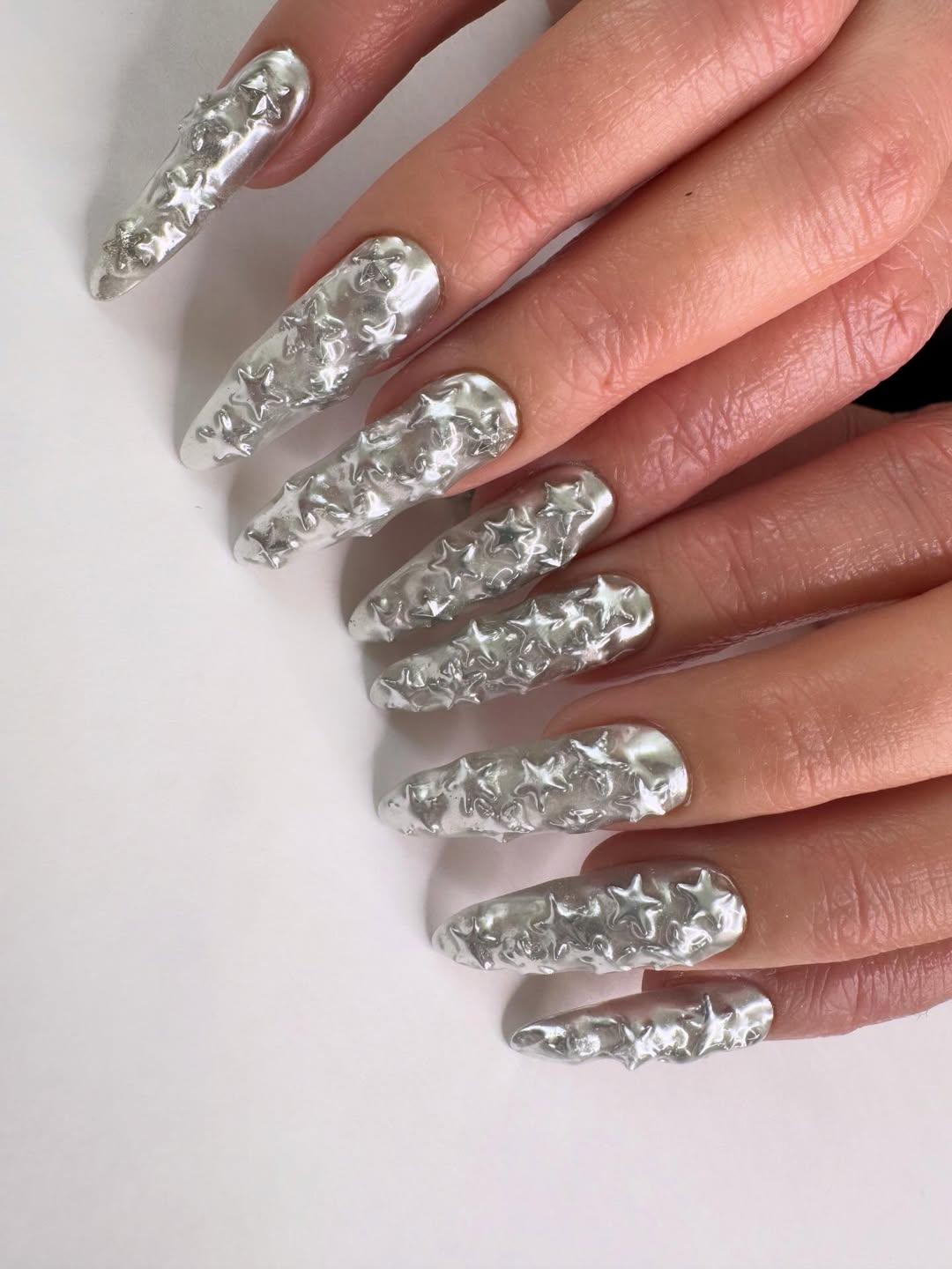 Кстати, вот и звезды. Объемный маникюр с и серебром прекрасно воплощает тренд extra celestial, ведь это название переводится как «экстразвездный». Такой 3D-дизайн повторить самой очень сложно, но он точно будет тебя радовать!