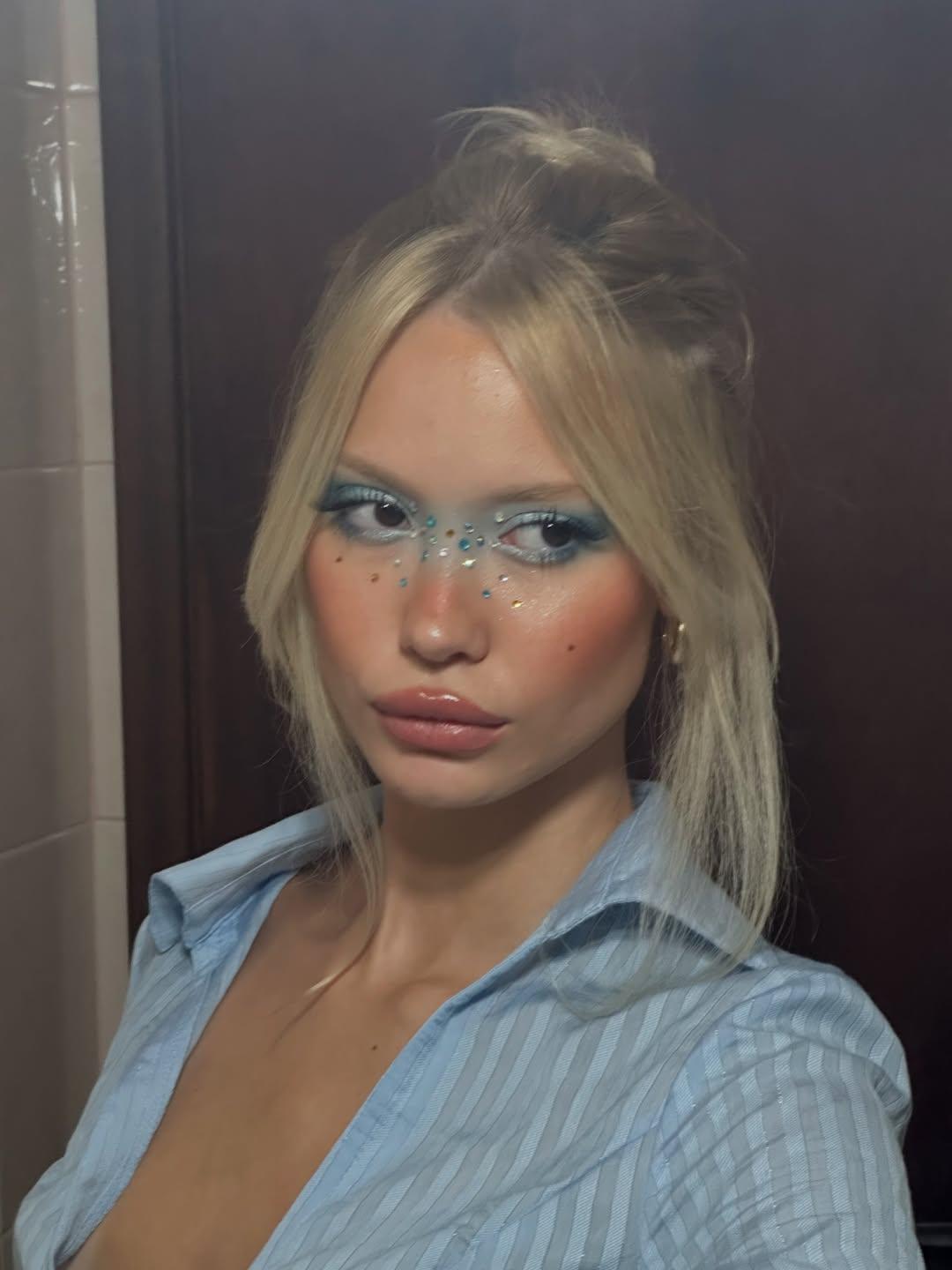 Если хочешь сделать необычный и очень блестящий макияж, то приклей на лицу сразу кучу страз. А для глаз выбирай довольно простой макияж: серебряные шиммерные тени на всем веке, плавно переходящие в голубую растушевку на скулах и висках. Идеальное дополнение — тонкие стрелки.