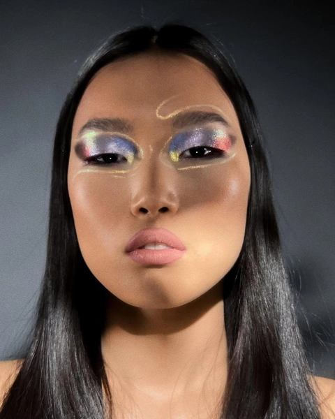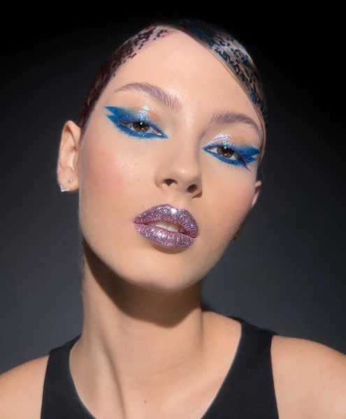 Тренд на макияж в стиле extra celestial касается не только губ и глаз, но еще и кожи. Сначала используй светоотражающую базу, потом легкий тон, а затем щедро нанеси хайлайтер на нос, лоб, скулы. Остальной мейкап тоже выполняй в сияющих оттенках — тени с шиммером и глосс с блестками.