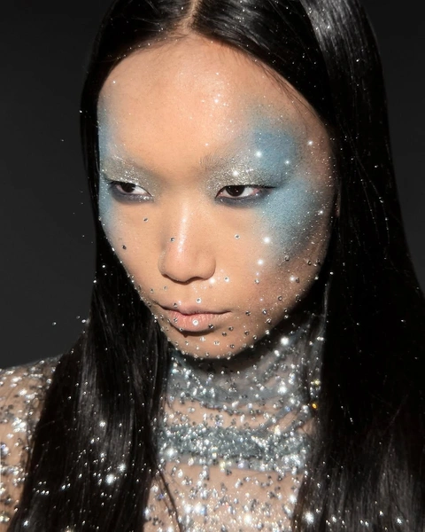 Эта эстетика строится на эффекте «нереальности»: тенях, напоминающих лунную пыль, металлических маникюрах, инопланетных нарядах. Это футуризм без стеснения и тормозов! Я собрала несколько красивых образов в духе extra celestial, которые доказывают, что если уж уходить от реальности, то в блестках!
