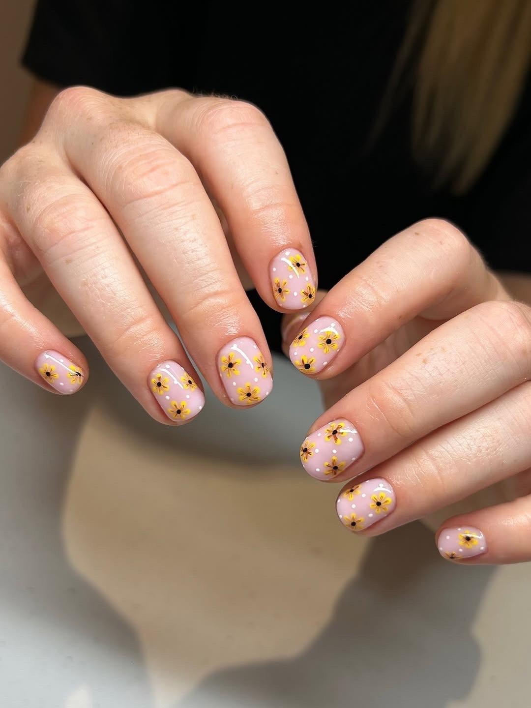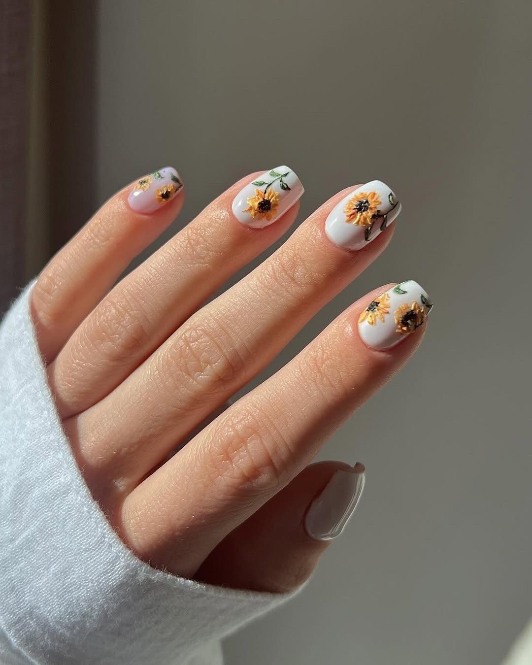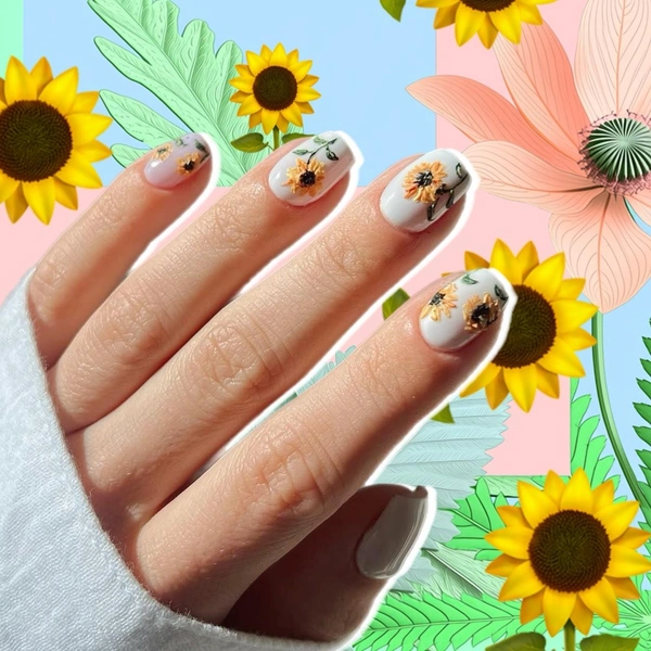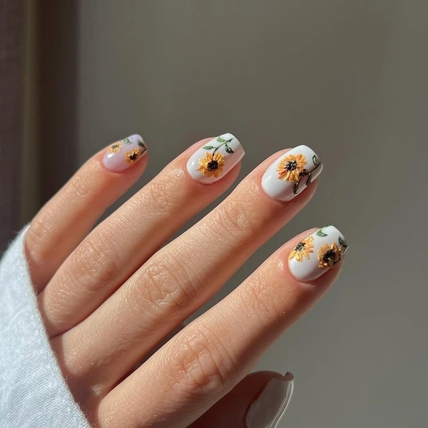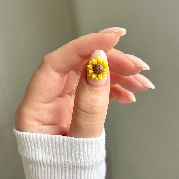 В нейл-арте подсолнухи — настоящий мастхэв для всех, кто устал от минималистичных нюдов и хочет добавить в образ яркости. А еще этот цветок на удивление универсален. Он может быть и главным героем, и деликатным акцентом. Один крупный подсолнух на весь ноготь на прозрачной базе — база. Россыпь крошечных цветочков на молочном фоне смотрится нежно, несмотря на яркий цвет.