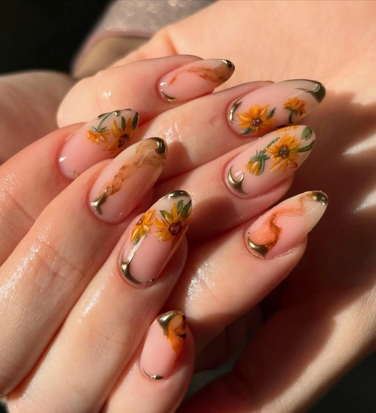 Поклонницам минимализма придется по душе маникюр на нюдовой основе. Сначала накрась ногти нейтральным полупрозрачным лаком, а потом на нескольких пальцах нарисуй подсолнухи. Пусть они будут не очень большими, но довольно реалистичными. Не забывай прорисовывать и листья со стебельками! На других ногтях изобрази акварельные разводы в коричнево-желтой гамме. А потом добавь золотые элементы с небольшим объемом. Готово! Такой маникюр будет смотреться довольно необычно, но он не перетянет на себя все внимание.