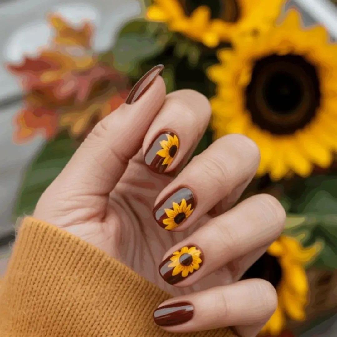 Самый простой вариант маникюра — это крупные цветы на однотонном покрытии. Сделать его получится у каждой! Сначала покрой ногти базой, а потом нанеси пару слоев темного лака. Удачно будут смотреться теплые оттенки коричневого. Затем рисуй подсолнухи. Если ты не умеешь рисовать, то это тот самый дизайн, в котором удачно будут смотреться наклейки. Главное, чтобы они все были одинаковыми и создавали гармоничный маникюр.