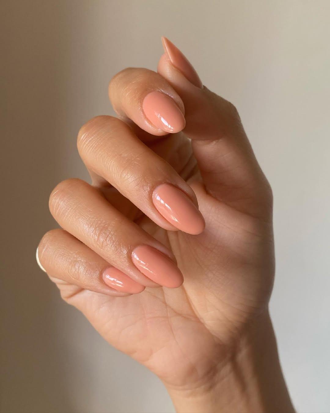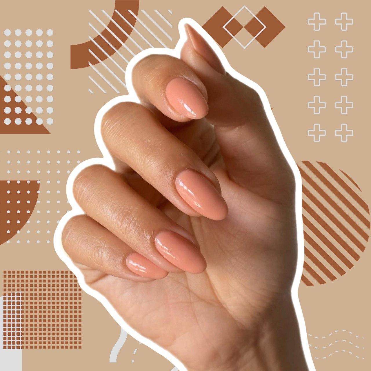 А напоследок лови еще один вариант персикового маникюра. Только в этот раз советую обратить внимание на плотный лак, а не желейный. Он будет очень стильно смотреться как с деловыми луками, так и с отпускными или повседневными нарядами. Овальная форма или миндаль — лучшее для него дополнение.