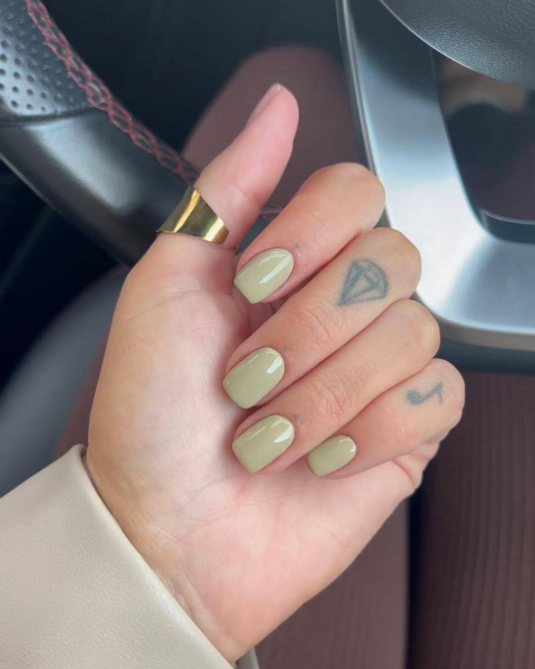 Маникюр с салатово-оливковом цвете будет выглядеть круто с осенними образами. При этом он не такой тяжелый и насыщенный, как многие другие оттенки зеленого. Этот приглушенный лак изумительно сочетается с золотыми украшениями, так что обязательно носи его с кольцами из металла теплого оттенка.