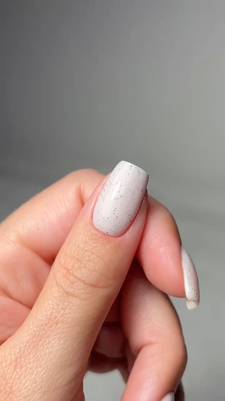 Когда-то очень популярными были лаки с эффектом перепелиного яйца — темными блестками разных форм и размеров. Сейчас этот тренд потихоньку возвращается, но в более деликатном и нежном варианте. Серо-бежевый лак с мелкими вкраплениями понравится девушкам, которые любят минимализм, уютные образы и необычные цвета.