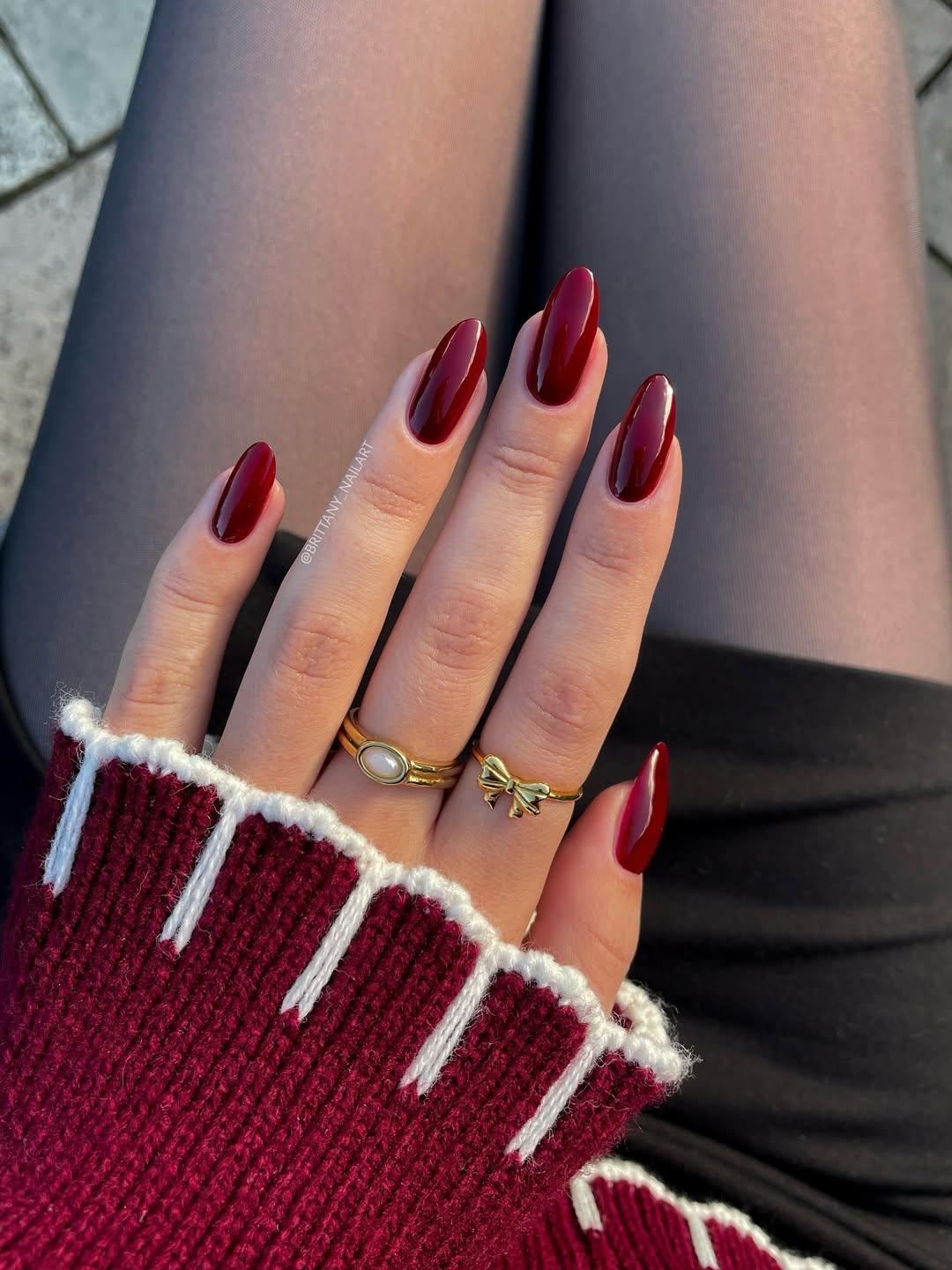 Темный винный оттенок — идеальный осенний цвет. Его любят даже те, кто не приемлет дизайны и яркость на своих ногтях. Советую сочетать его с другими элементами такого же цвета в своем образе: бордовыми сапогами, сумками, куртками и свитерами.