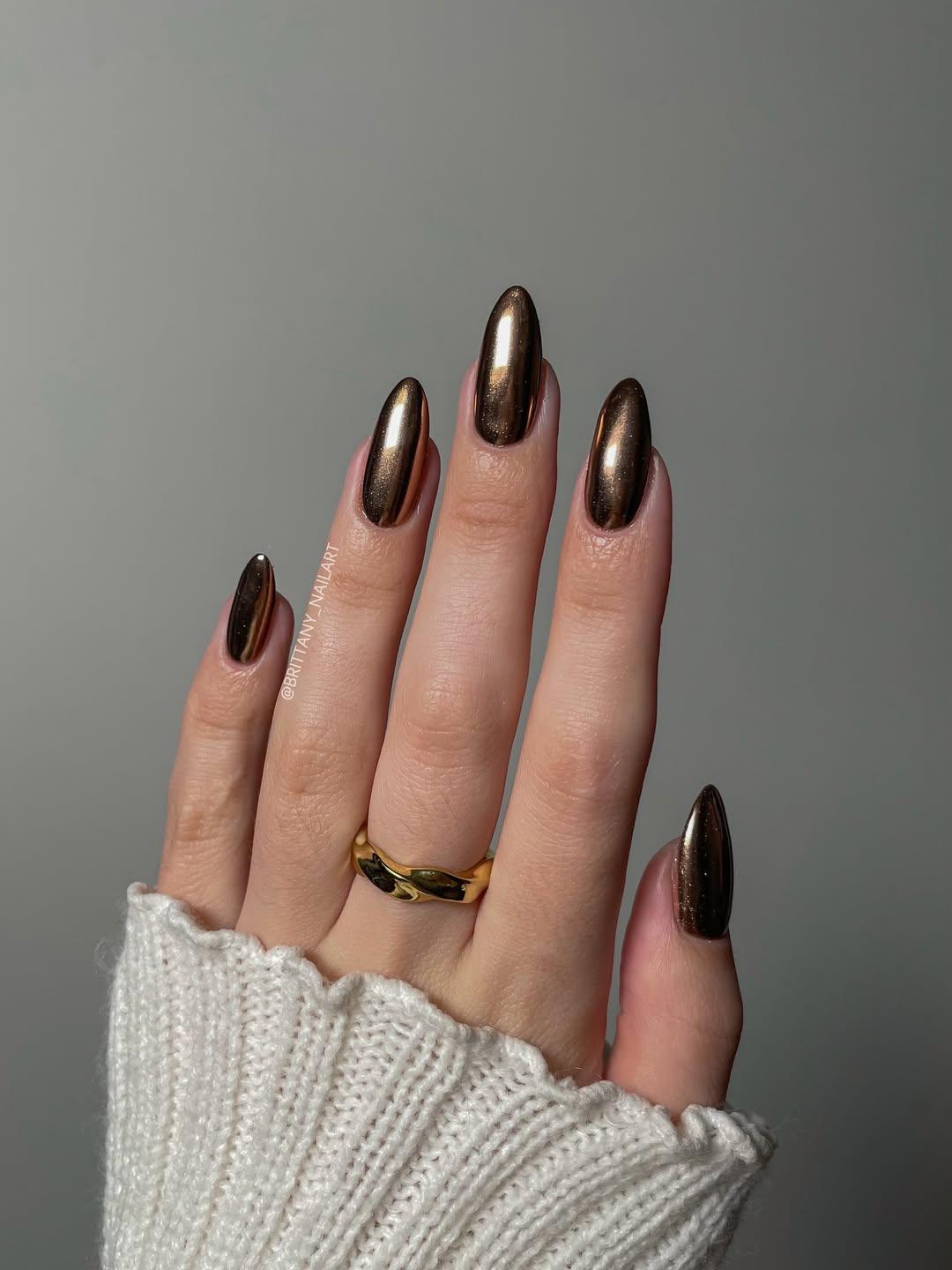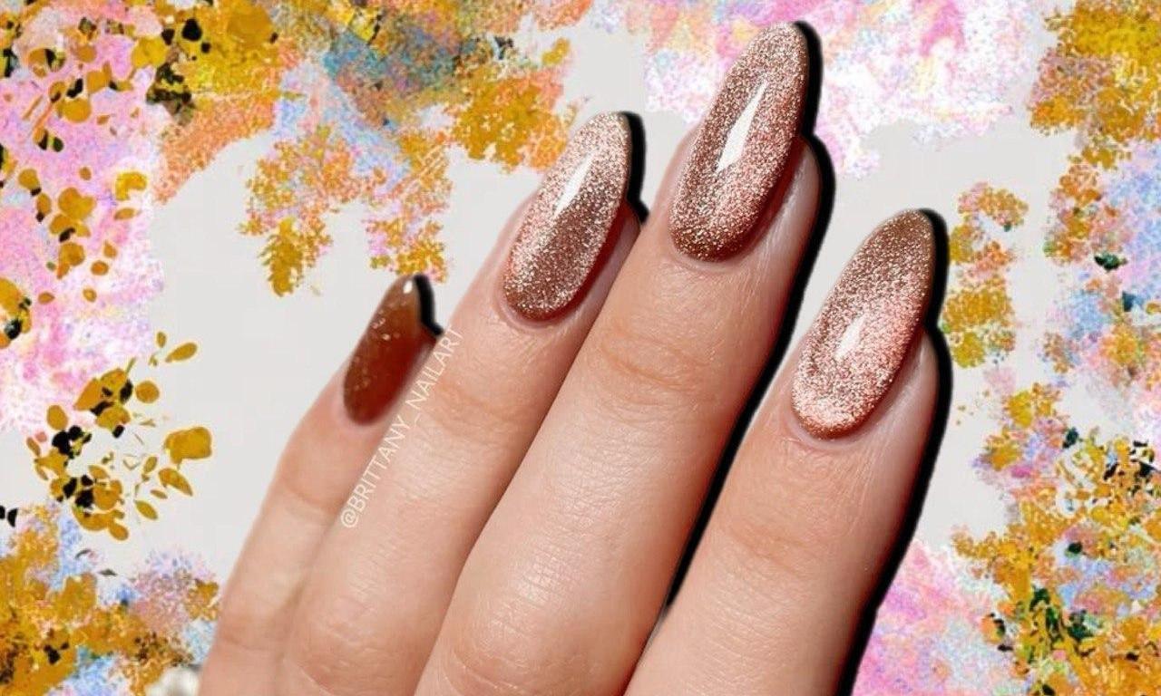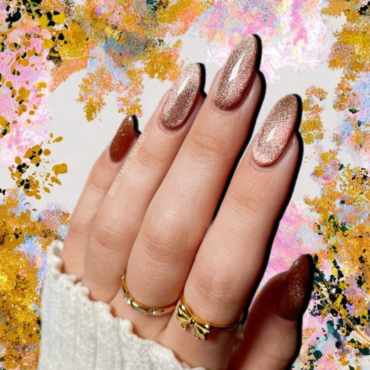 Тем, кто не любит обычные кремовые текстуры, наверняка понравится лак с шиммером. Коричневый лак с золотистыми блестками смотрится очень уютно и нарядно. Можешь носить его с осенними нарядами, а можешь сохранить для деликатного новогоднего дизайна ногтей в теплой гамме.