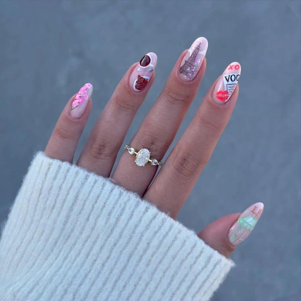 Хоть в новом сезоне Эмили и окажется в Риме, но главным героем предыдщуих сезонов был Париж, поэтому можно посвятить дизайн этому городу. Нарисуй на ногтях Эйфелеву башню, круассан с чашкой кофе и страничку их модного журнала Vogue.
