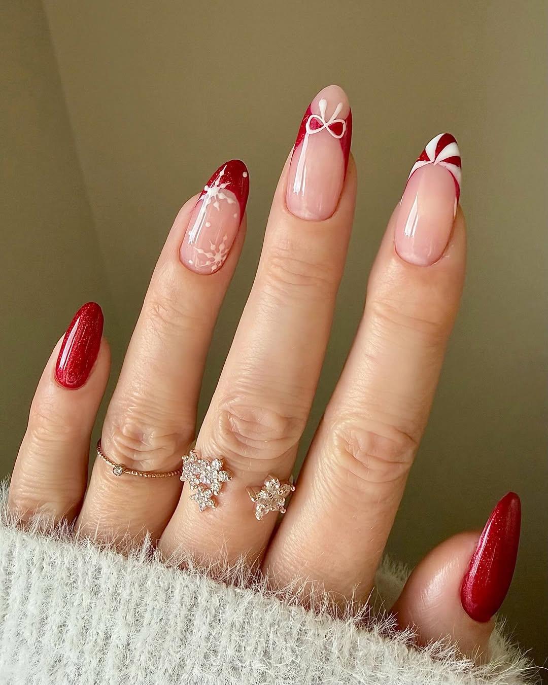 Каждая уважающая себя жительница Парижа хоть и любит нюд, но для особых мероприятий не отказывается от разнообразных дизайнов. Например, на Рождество или Новый год можно сделать красный френч со снежинками и конфетами.