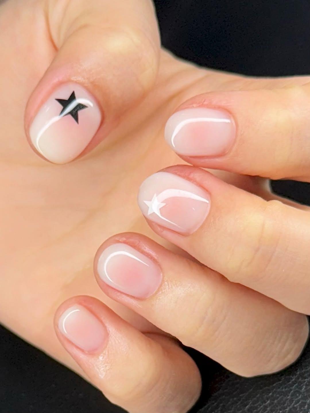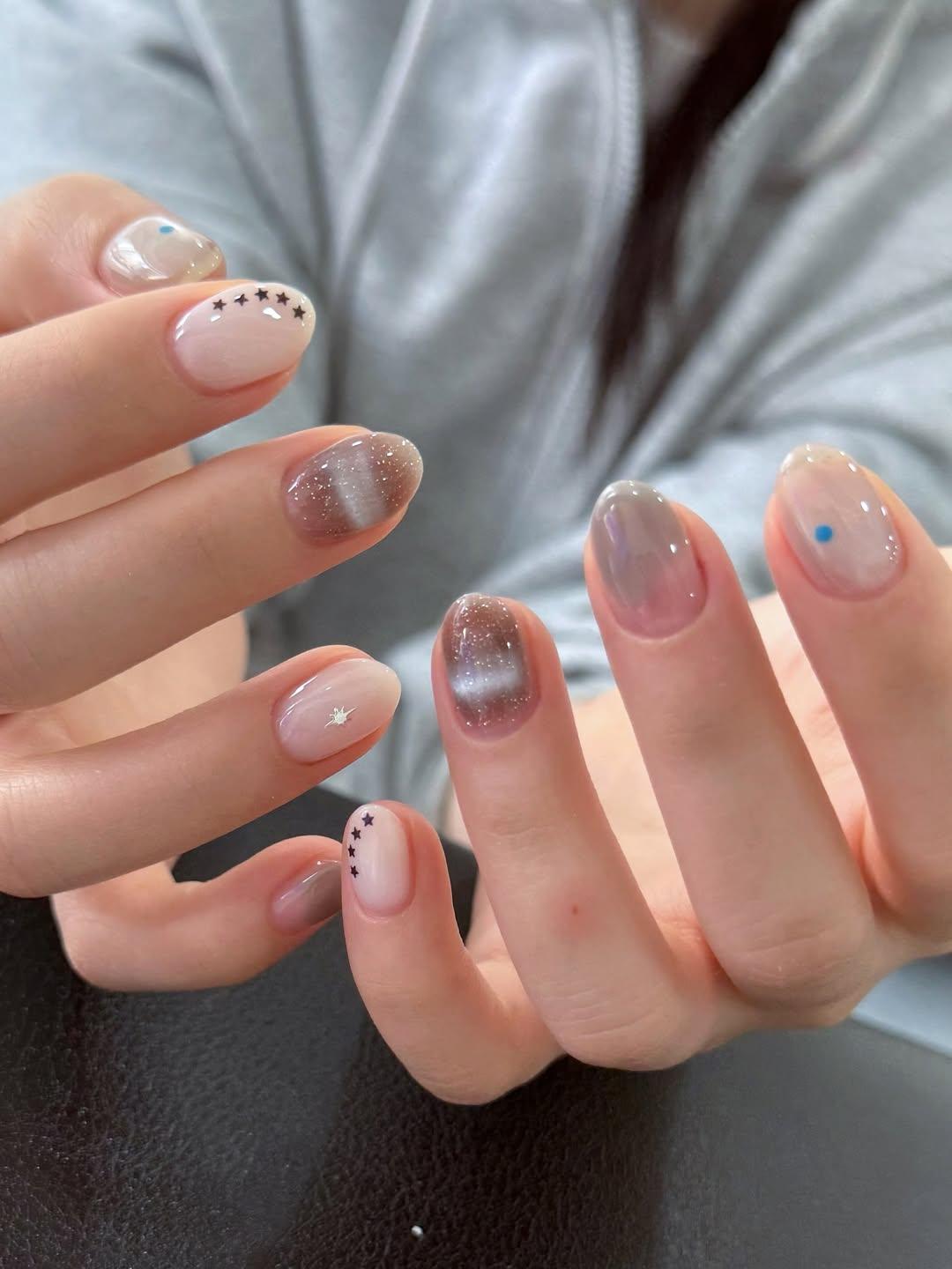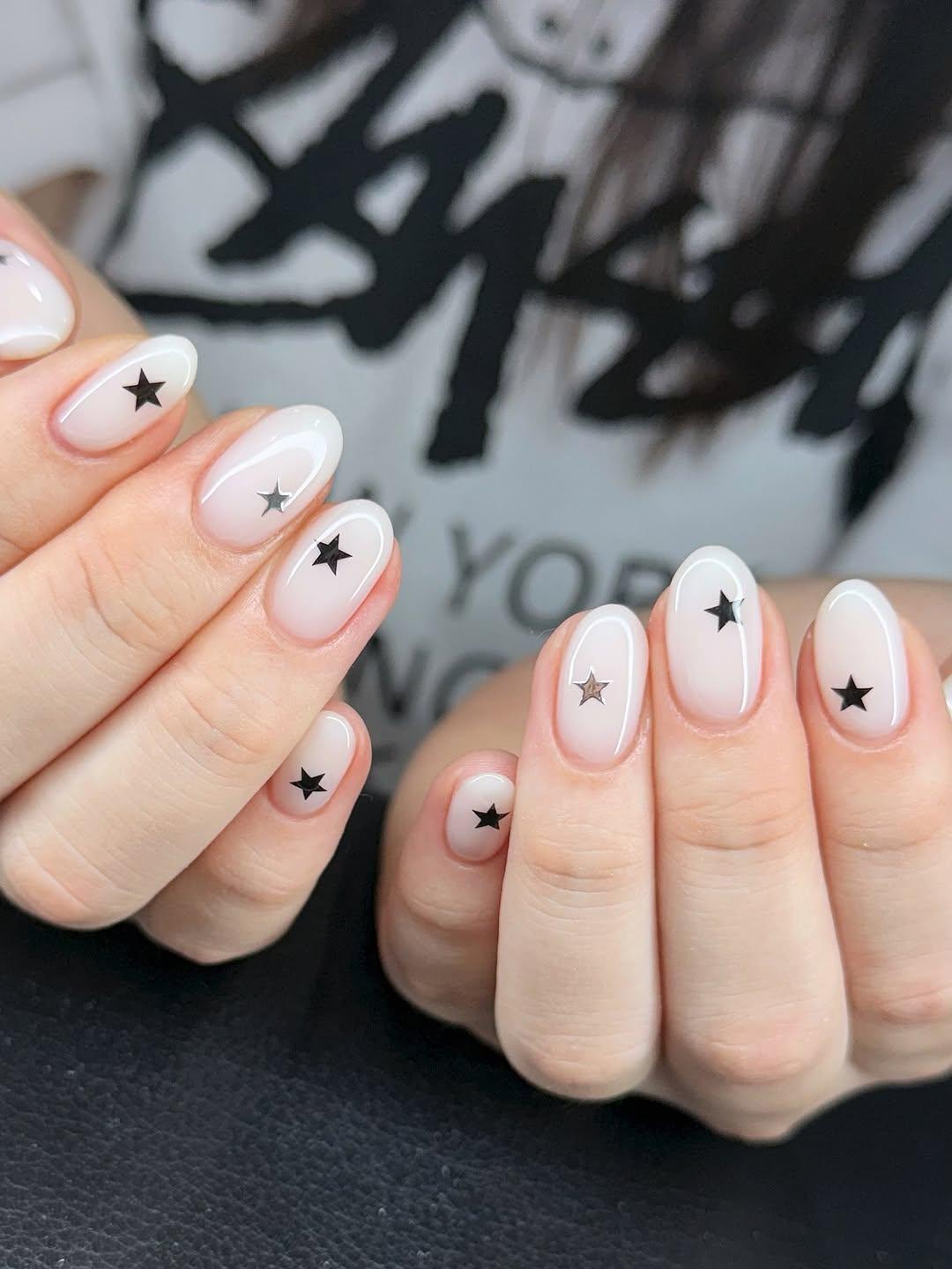 Я собрала несколько дизайнов ногтей, которые тебе тоже понравятся. Самый простой из них — молочный маникюр с серебряными или черными звездочками. Ты легко можешь сделать такой дизайн дома, используя кусочки глиттера. Укрась ими все ногти или только парочку. Любой вариант классно выглядит.