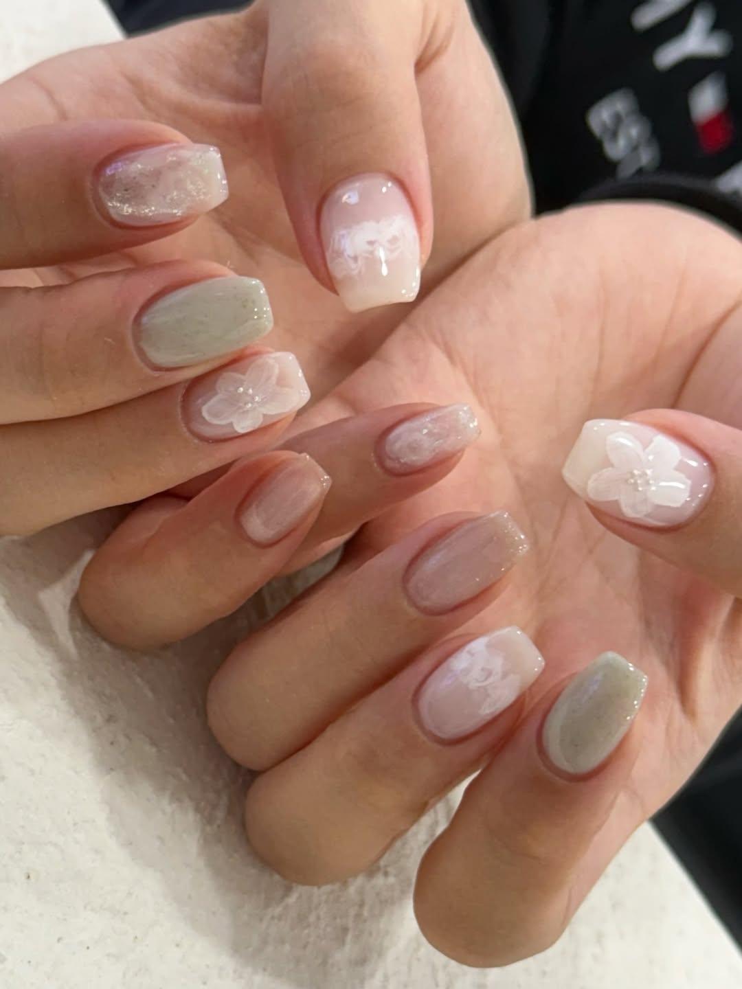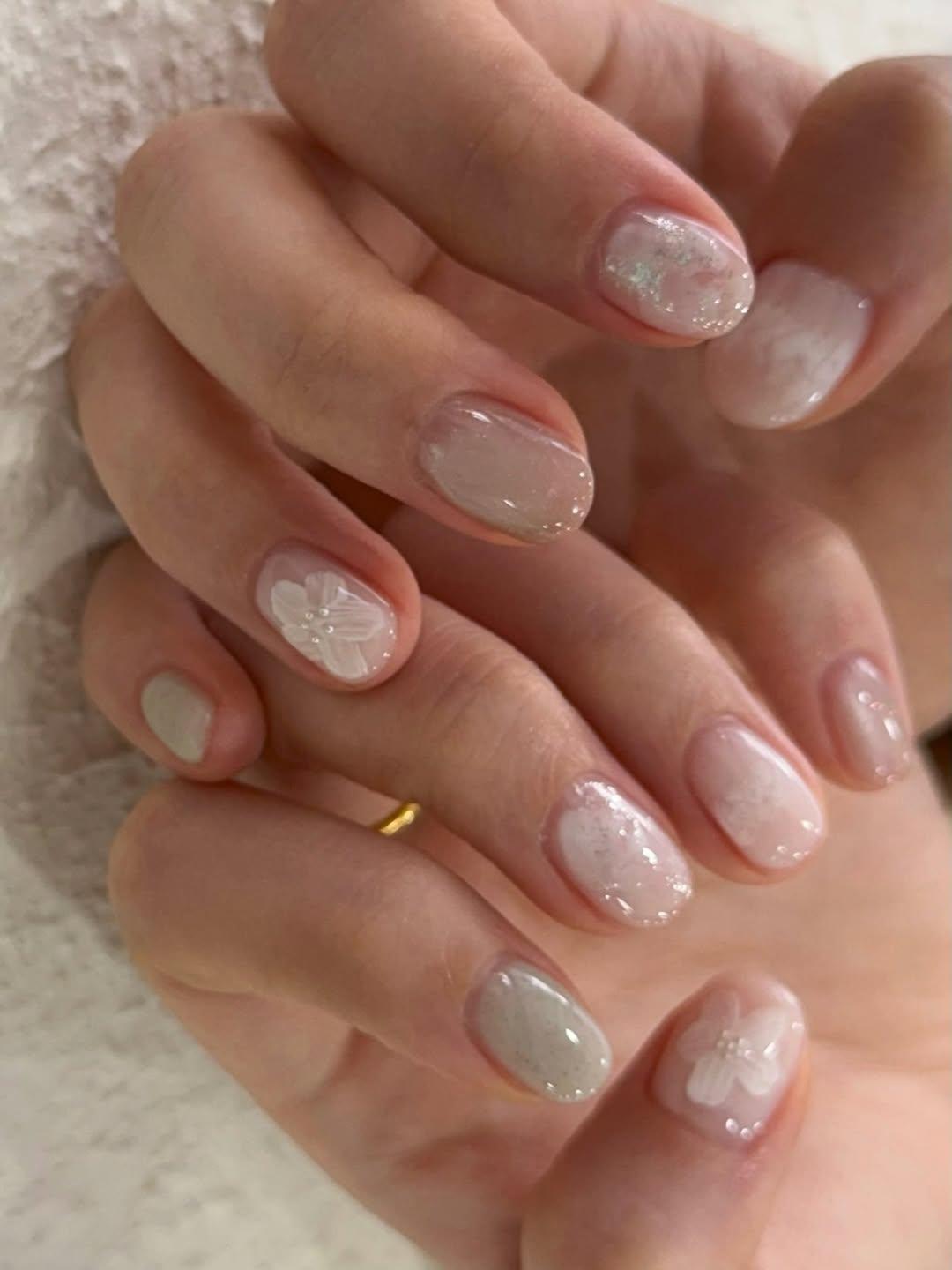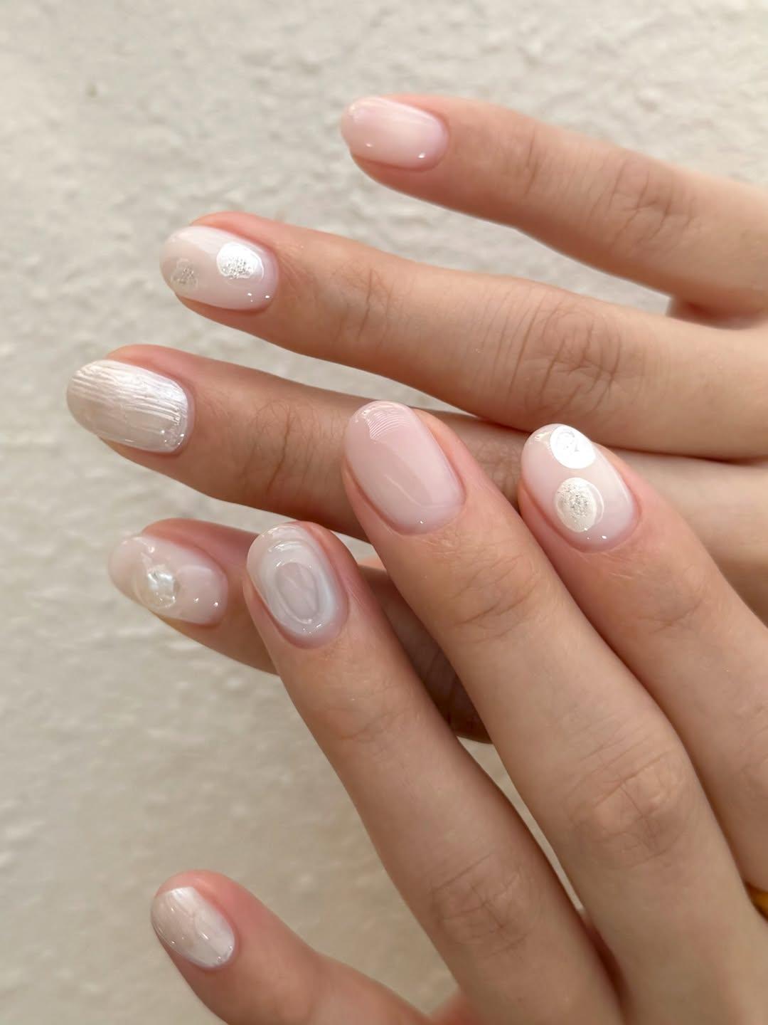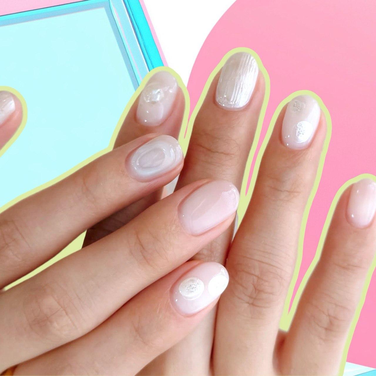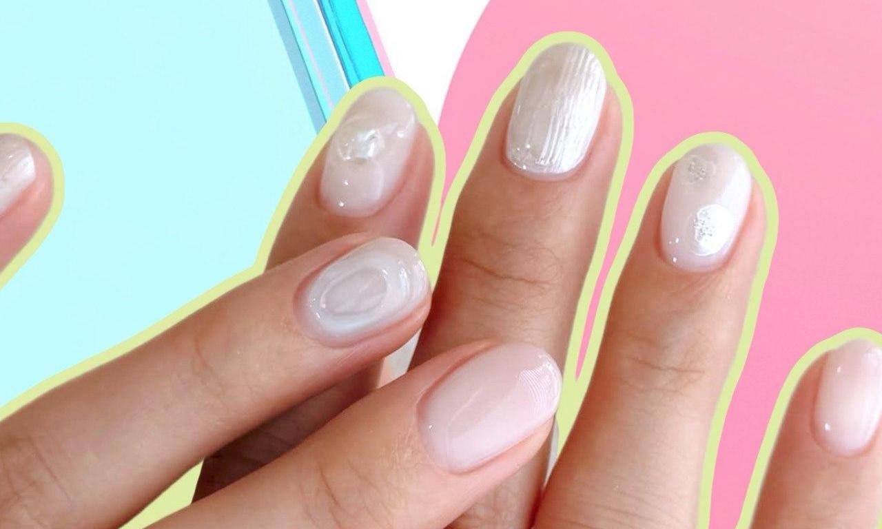 Тем, кто любит незаметные дизайны, понравится акварельно-перламутровый нейл-арт. На нескольких ногтях нарисуй легкий объемный узор, на других размести полупрозрачные белые пятнышки. Для других выбери жемчужный лак с переливами. Можно также использовать «кошачий глаз» и тонкие серебряные рисунки. Такой маникюр будет одновременно нюдовым и необычным.