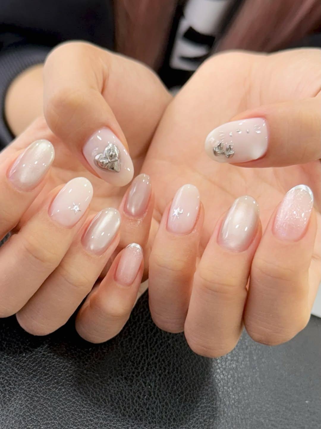 Если уж хочется сделать что-то нюдовое, но не бледное, то лови вариант для тебя! Несколько ногтей покрой молочным лаком и сделай на них какой-нибудь минималистичный дизайн. Это могут быть миниатюрные черные звездочки, изящные серебряные точки (они могут быть объемными) или красные сердечки.