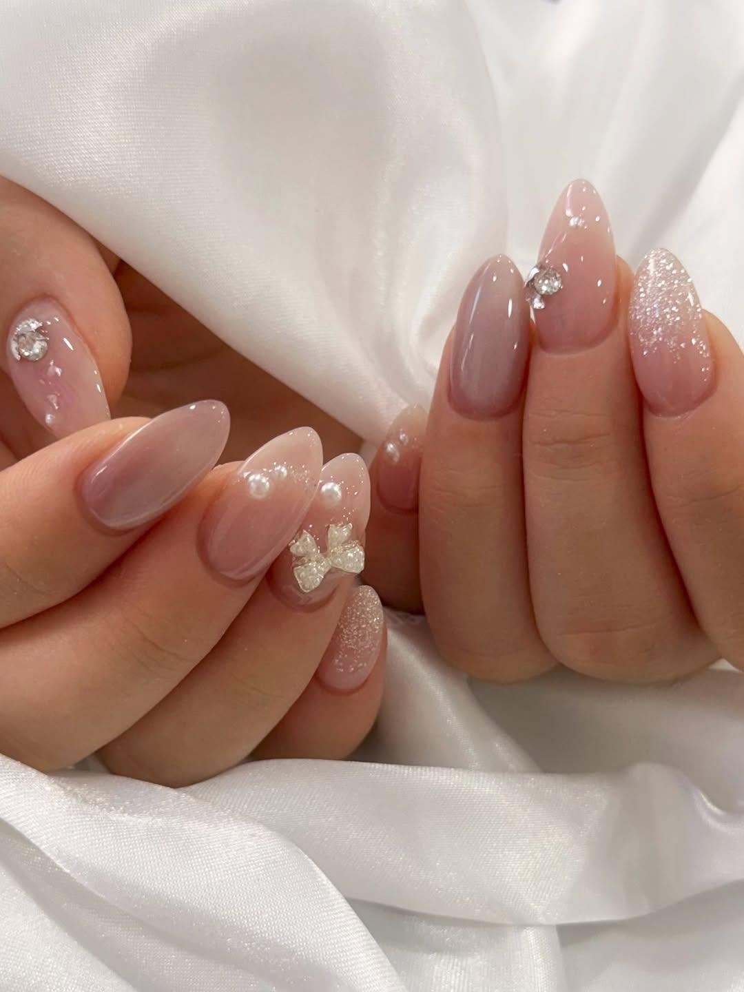 Если хочешь, нарисуй на ногтях цветы белой акварельной краской. Серединки укрась жемчужинами или бульонками. Этот дизайн — настоящее воплощение женственности. Тем, кто любит блестки, можно выбрать хрустальный «кошачий глаз». Он выглядит ярче, чем популярные сейчас шелковые варианты. Объемные бантики или стразы завершат дизайн, но они подойдут только любительницам объемов.
