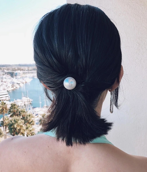 Эту прическу сделать несложно. Сначала раздели волосы на две части и скрути обе из них в жгуты. Затем собери низкий хвост и закрепи резинкой с жемчужным декором. Так скрученные части останутся такими до аксессуара и станут обычными распущенными по длине. Хотя вообще-то жемчуг добавит элегантности даже самому простому хвосту и коротким волосам.