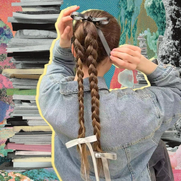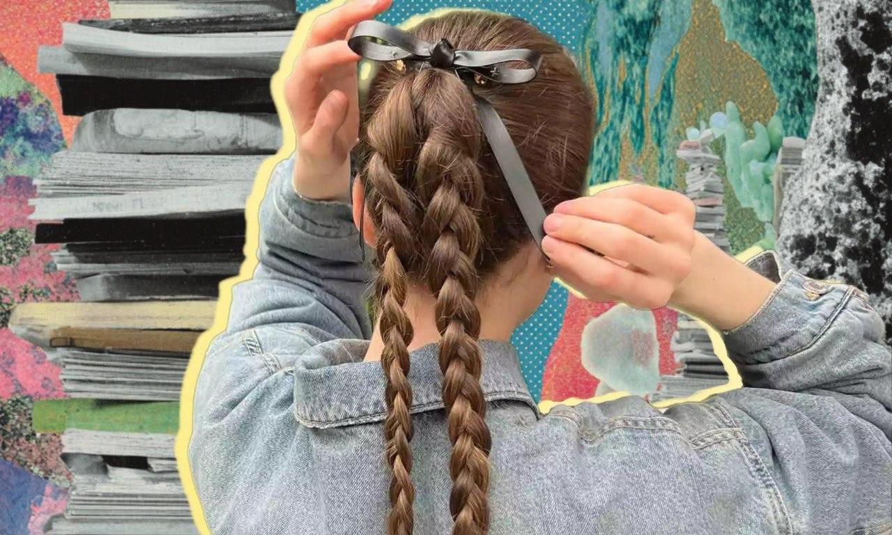 Сначала сделай хвостик, а потом раздели его на две пряди, которые заплети в обычные трехпрядные косички. В конце завяжи тонкие резинки, а поверх прикрепи маленькие бантики на зажимах. Получится милый образ в стиле cottagecore. Если хочешь, то и основание хвоста тоже укрась бантом. Эта прическа прекрасно подходит для прямых и волнистых волос средней длины и длинных.