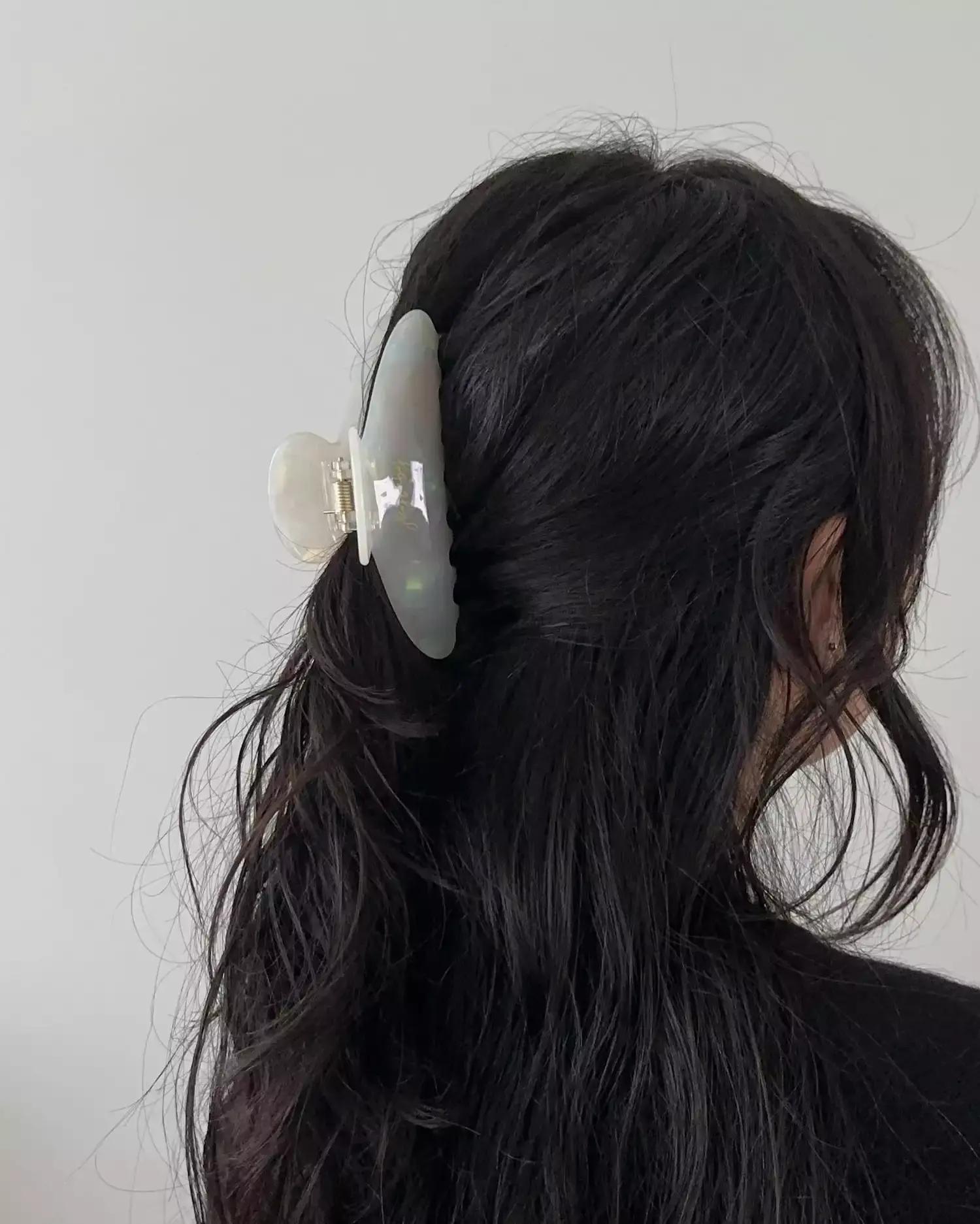 Собери верхнюю часть волос на макушке и закрепи крабиком вместо резинки. Такие заколки сейчас в тренде — от минималистичных пластиковых до украшенных стразами и металлическими элементами. Идеально для повседневной носки и волос любой текстуры от плеч и длиннее.