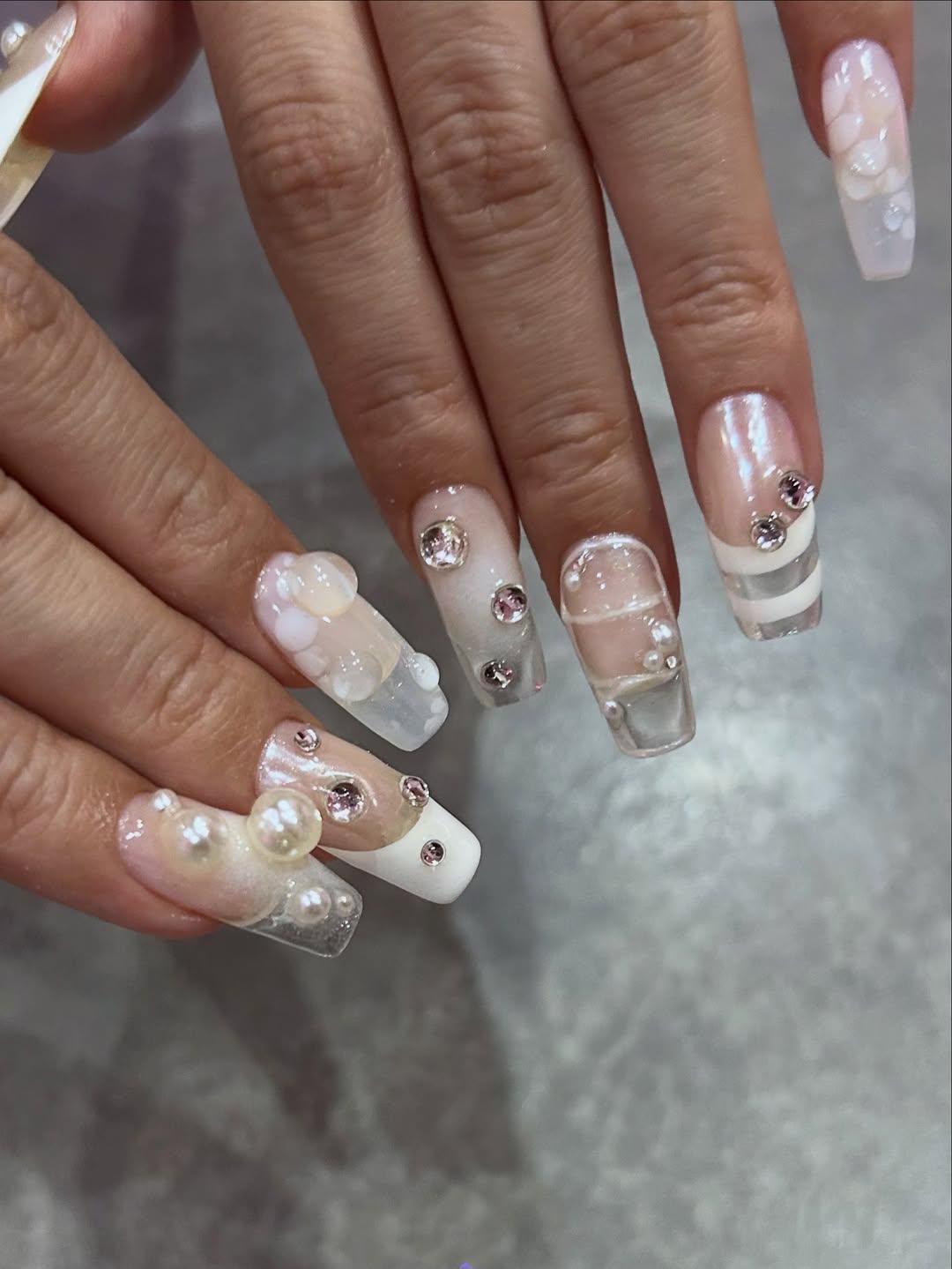 Тем, кому нравятся необычные маникюры, но не яркие цвета, точно захочется сделать белый дизайн ногтей. Размещай на ногтях стразы, делай френч, используй голубую жемчужную втирку. А чтобы было еще более воздушно, то повторяй этот маникюр на прозрачном наращивании.