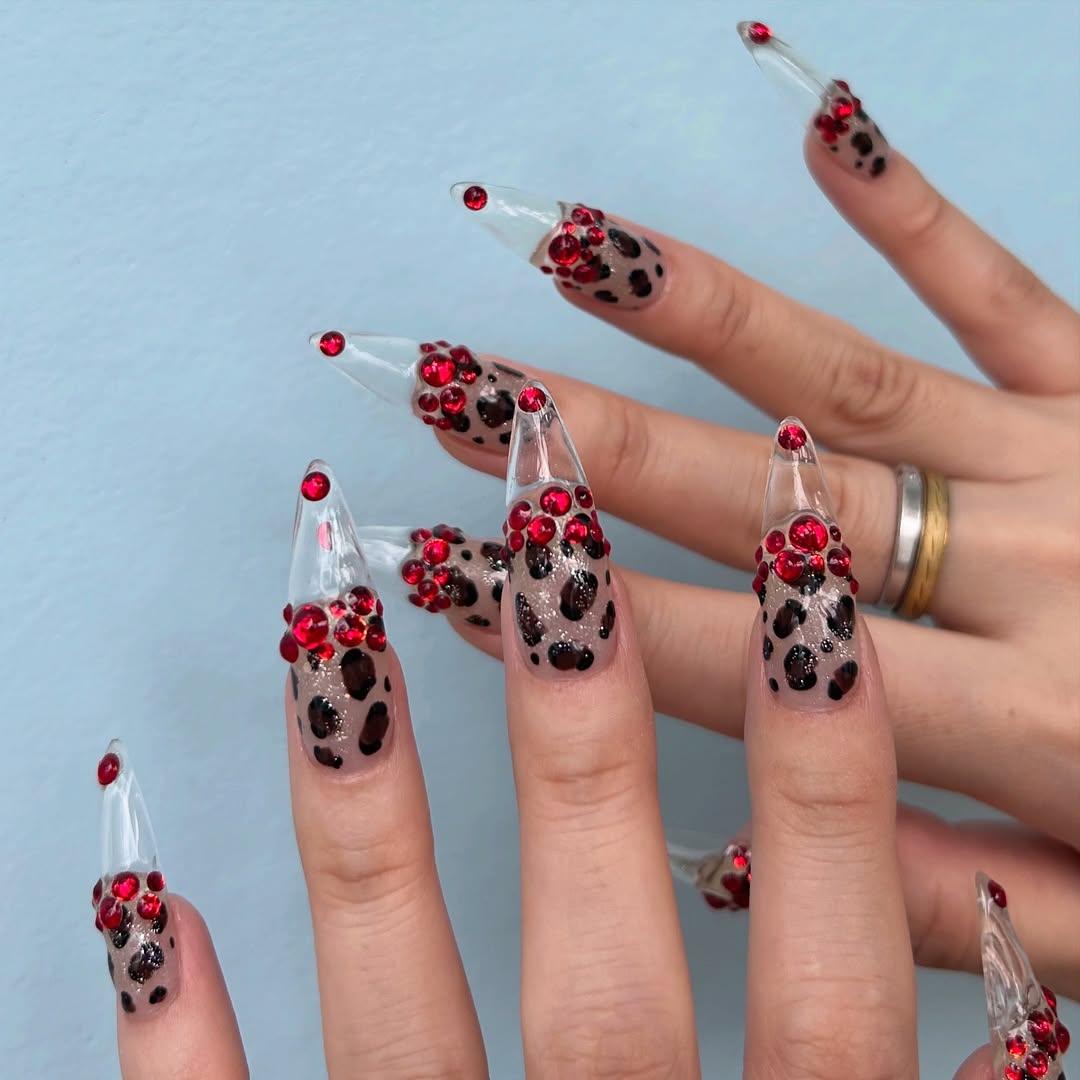 Стразы можно вписать и в анималистичный дизайн ногтей. Прозрачные ногти с коровьими черными пятнами и красными блестящими камушками — самое роскошное сочетание. Если ты делаешь наращивание, а не открашиваешь свои ногти, то это классный вариант дизайна.