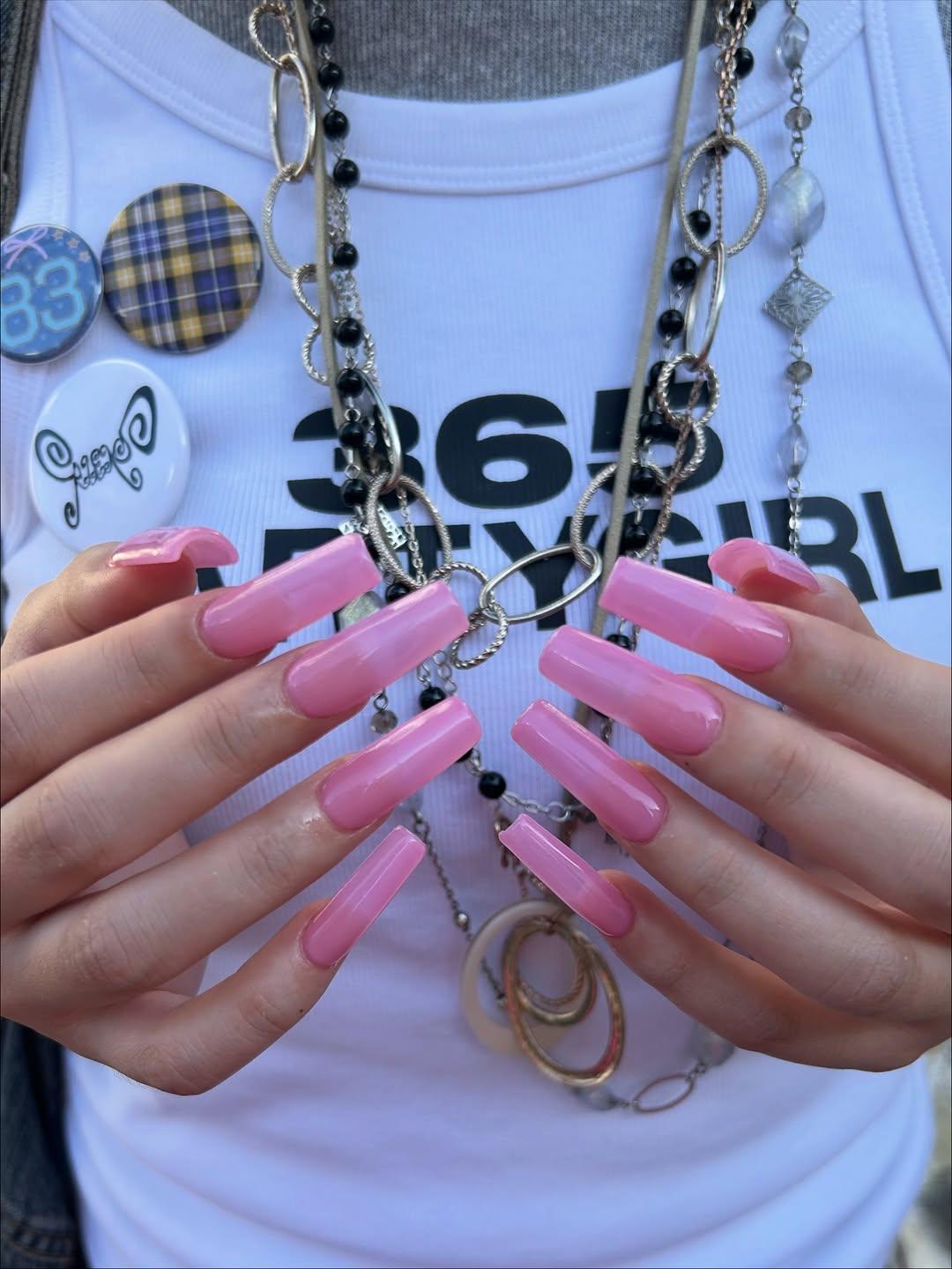 Если не хочется делать что-то яркое, однотонный маникюр в оттенке Барби отлично впишется в твой образ. Советую подобрать лак с желейной текстурой, чтобы она выглядел не так плоско и скучно, как стандартный крем.