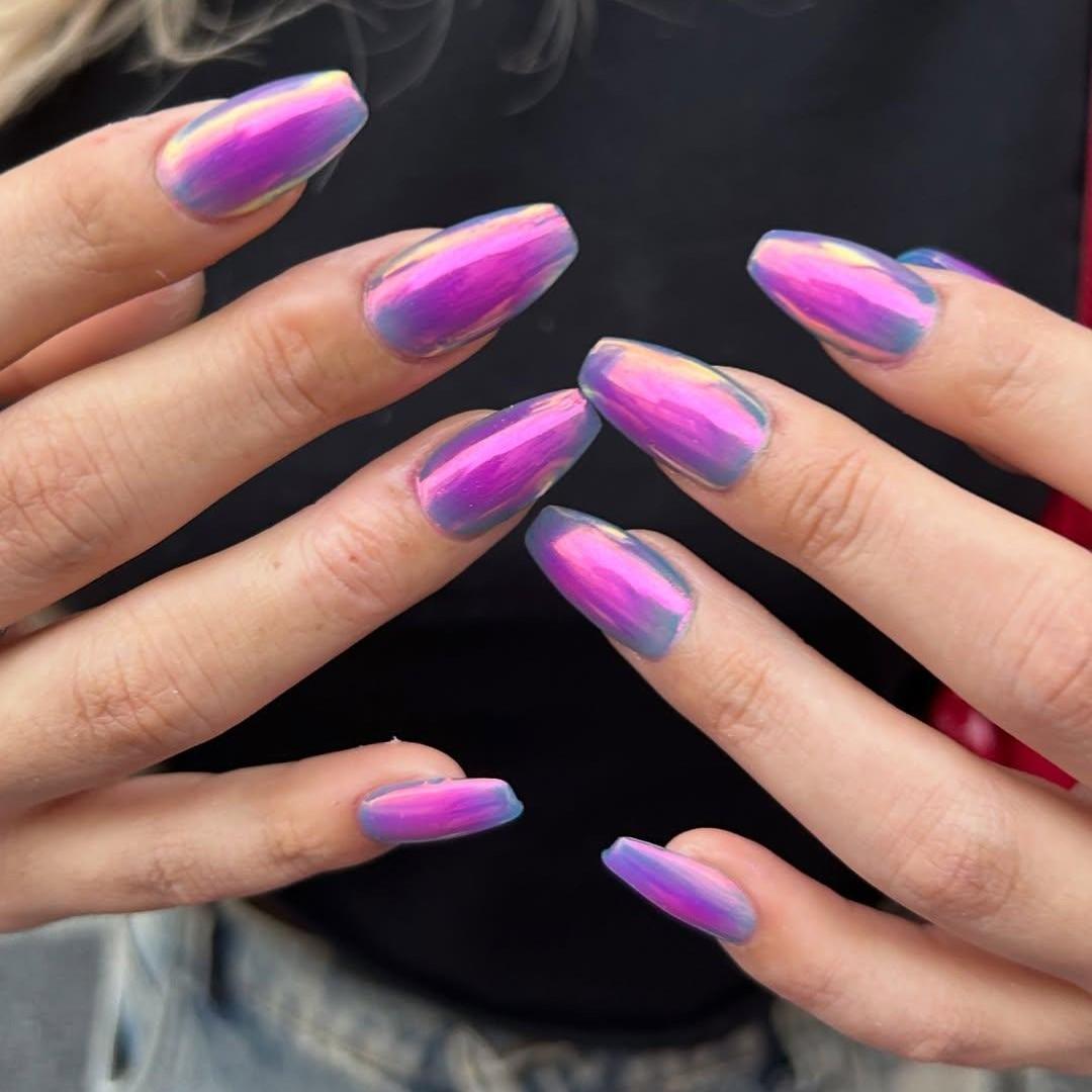 Втирка на длинных ногтях тоже смотрится шикарно. Найди самый яркий вариант! Фиолетово-голубое космическое сияние украсит любую длину: от «под корень» до XXL. Такие ногти будут переливаться по-разному под каждый углом, так что ты точно будешь их рассматривать!