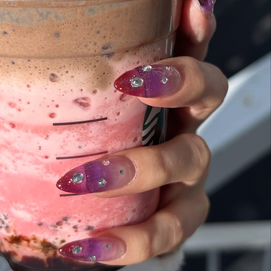 Когда не хочешь использовать втирку, можно сделать малиново-фиолетовый градиент на кончиках ногтей. Он прекрасно смотрится на миндалевидной форме и стилетах. Дополнить такой маникюр можно стразами, если хочется чего-то поинтересней.