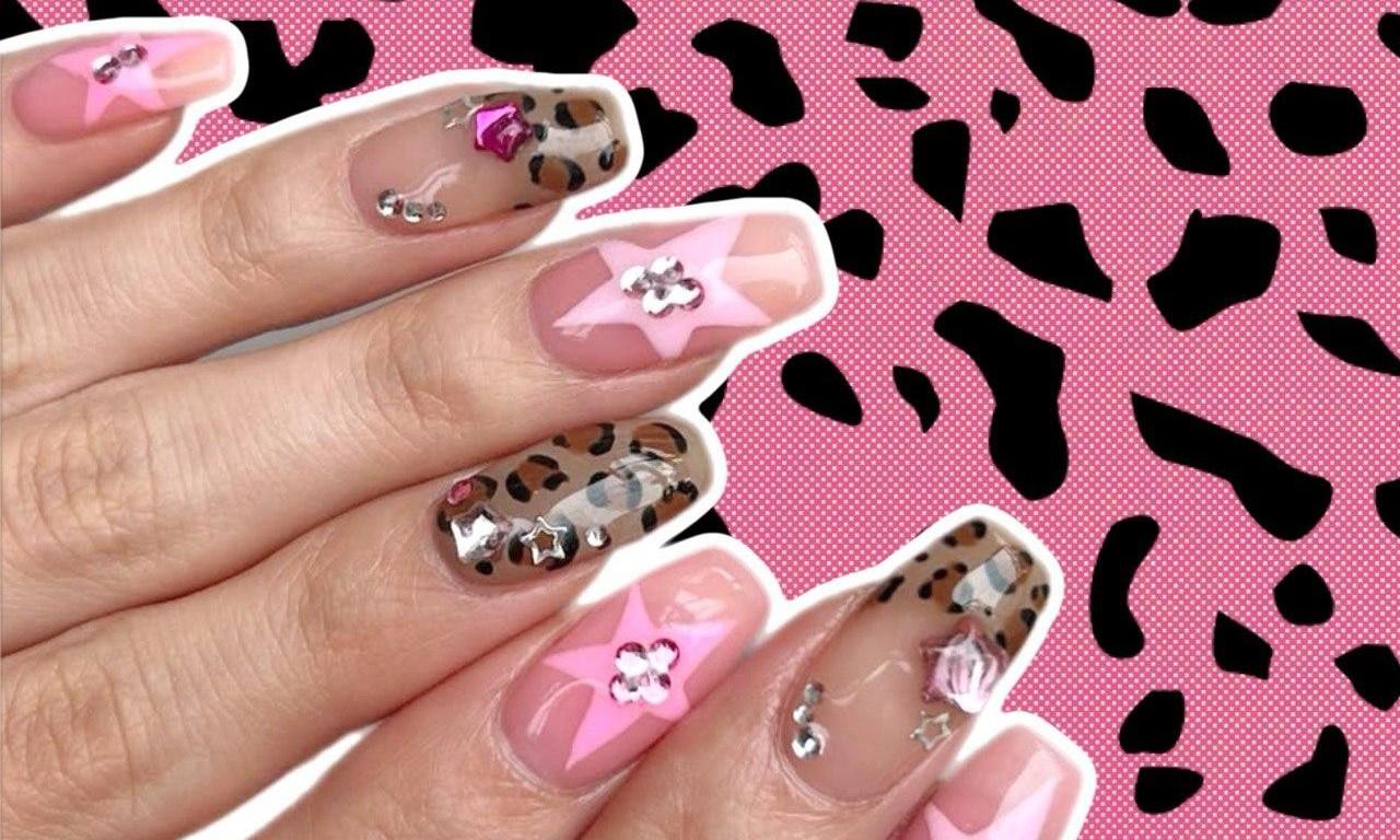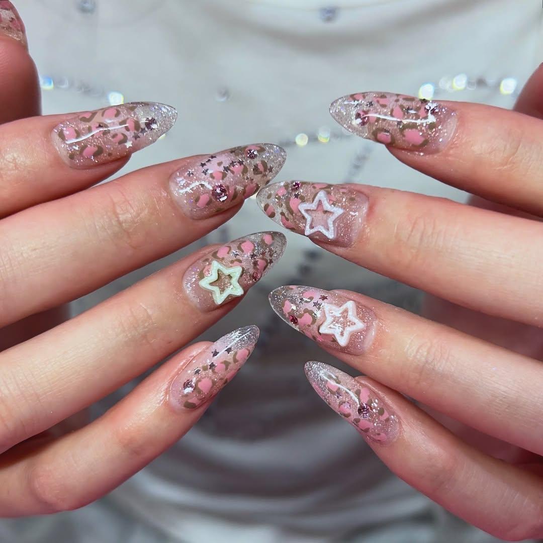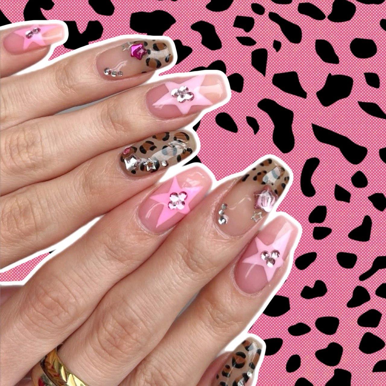 Понравилось сочетание леопардовых пятен с розовым лаком? Лови еще один способ того, как их сочетать. В этом маникюре основным будет полупрозрачный блестящий лак, основным рисунком станут розово-коричневые детали шкуры леопарда, а в качестве необычного акцента приклеивай белые звезды.