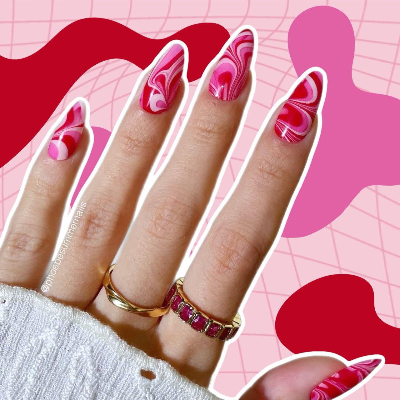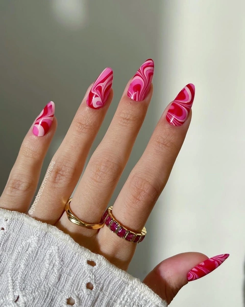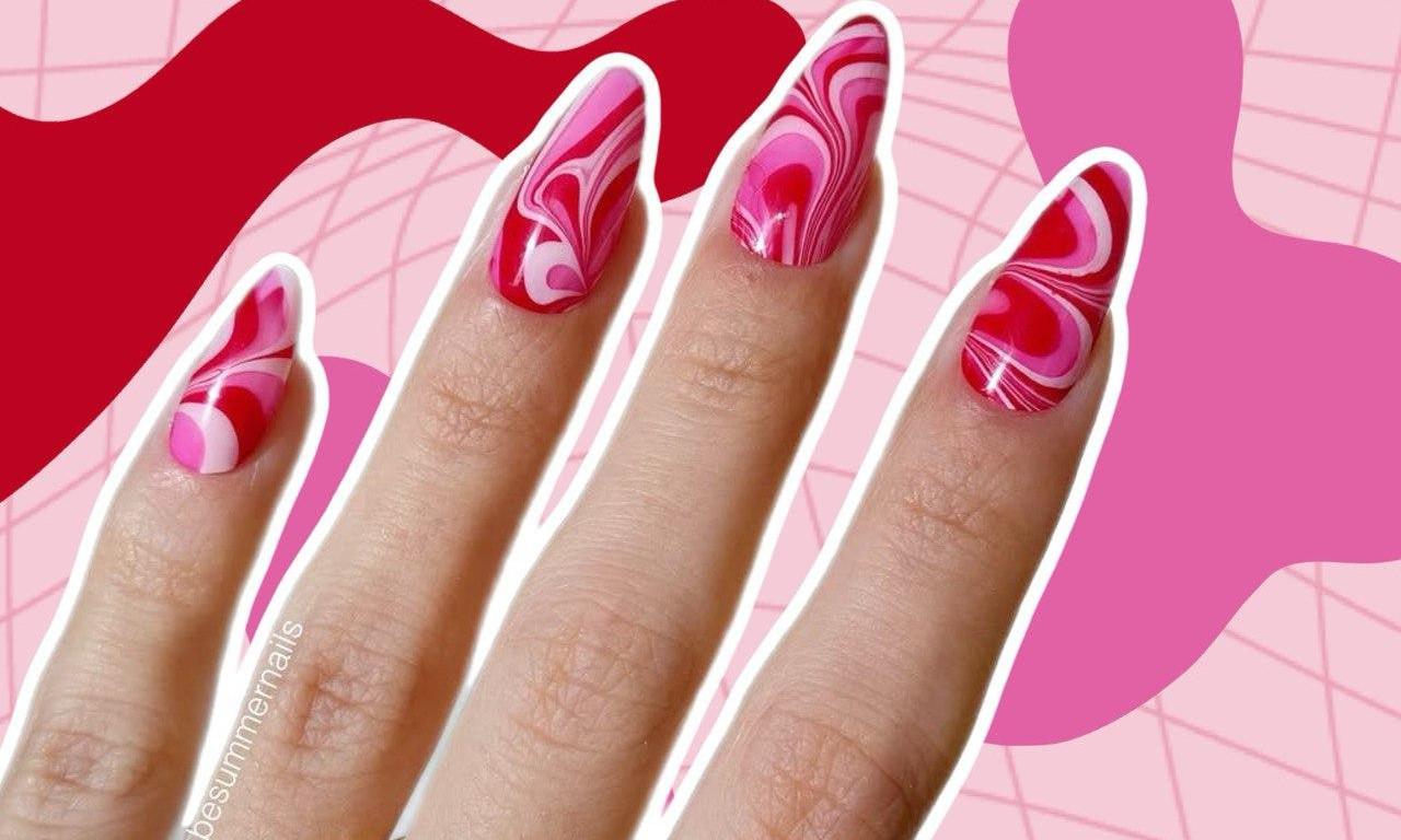Разводы и мраморные узоры напоминают постеры и ткани 60-х, где цвета смешивались с друг другом. Такой дизайн выглядит смело и необычно, особенно если использовать кислотные оттенки. Но даже мягкие пастельные разводы будут смотреться эффектно. Главное в таком маникюре — ощущение движения.