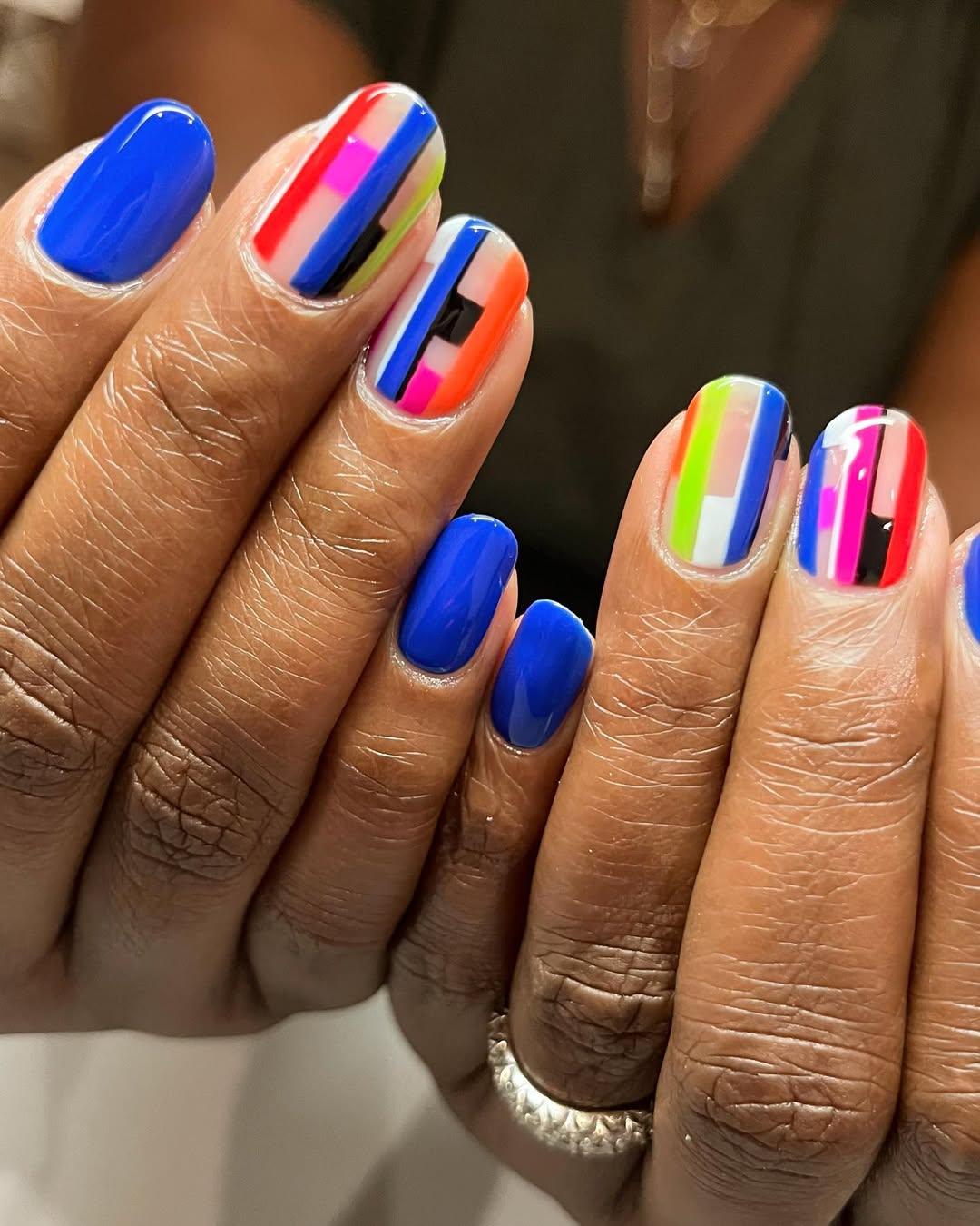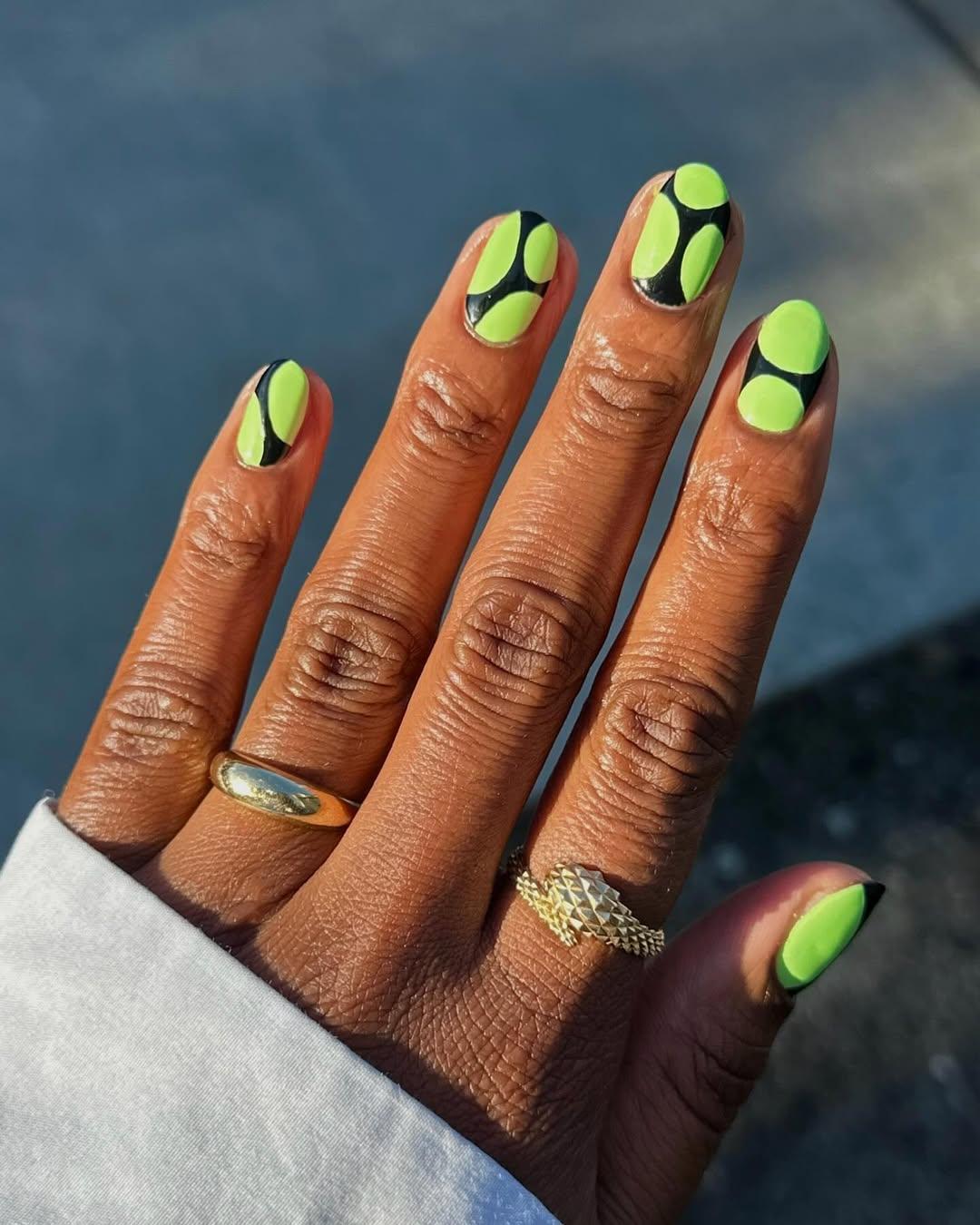 Контраст черного и яркого цвета напоминает дерзкий стиль рок-н-ролла. Черный с красным, желтым, неоном или даже розовым смотрится ярко и необычно. Такой дизайн можно сделать в виде полос, геометрии или выделить один ноготь черным, а остальные яркими.