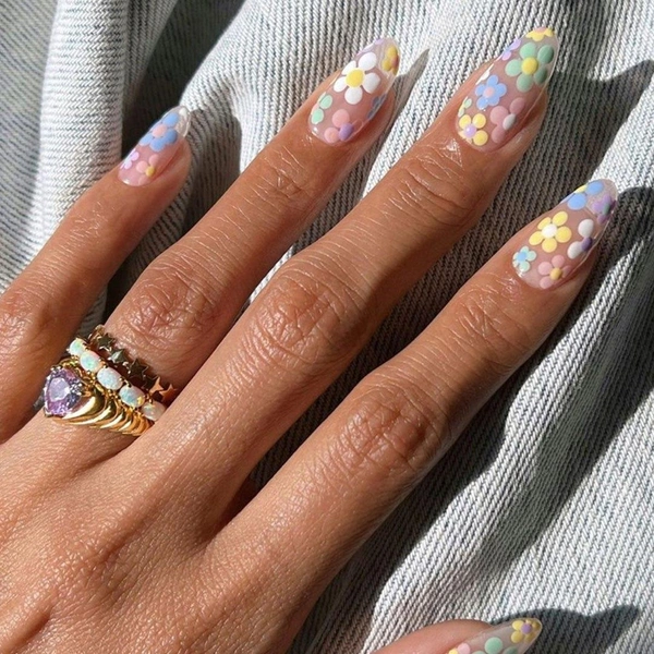 Эстетика хиппи невозможно без цветов — это их главный символ. В 60-е девушки носили венки и вышивку с ромашками, а сегодня мы можем перенести этот вайб на ногти. Цветочные дизайны бывают разными: от милых ромашек в пастели до ярких и контрастных цветов на неоновой базе. Такой маникюр будет смотреться как маленькое произведение искусства и всегда дарить летнее настроение даже осенью и зимой.