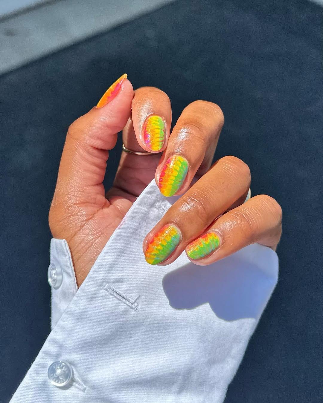Техника тай-дай родилась у хиппи, которые окрашивали футболки в яркие переливы. Сегодня тай-дай снова в моде и легко переносится на ногти. Размытые переходы цветов выглядят как мини-картины, и каждый ноготь становится уникальным. Такой дизайн — выбор для тех, кто не боится выделяться.
