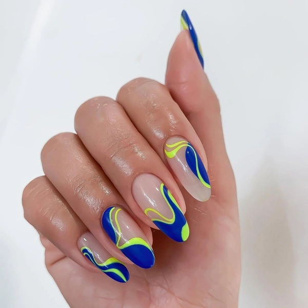 Волнистые линии — это отражение моды ближе к 70-м, когда узоры на постерах и одежде будто двигались и текли. Такой маникюр идеально подойдет для тех, кто хочет добавить в образ энергии и драйва. Волны могут быть яркими, в неоновой палитре — для дерзкого образа, или мягкими, в пастели — для романтичного настроения. Это дизайн, который выглядит одновременно расслабленно и эффектно.