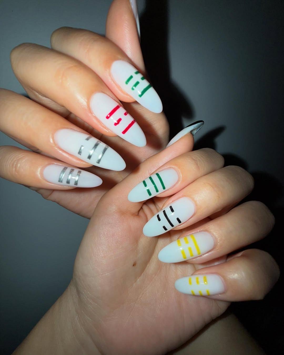 Прямые линии на ногтях — это привет из эпохи моды, когда графика и минимализм были на пике популярности. Можно сделать аккуратную вертикальную полоску, которая зрительно вытянет ногти и придаст им элегантности.