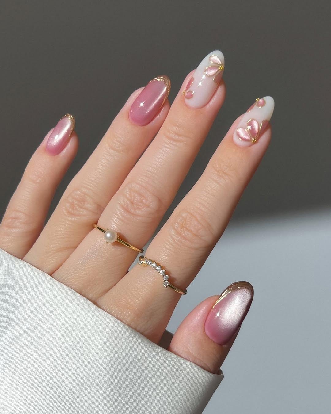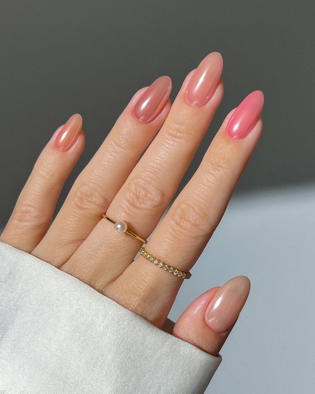 Ну а это самый нежный маникюр во всей этой подборке. Сделать его несложно, нужно лишь нанести на каждый ноготь разные нюдовые и нежные оттенки в розово-бежевой гамме. Затем покрой их все жемчужной втиркой и глянцевым топом. Готово! Этот маникюр точно будет привлекать внимание к себе, но смотреться он будет невероятно изящно.