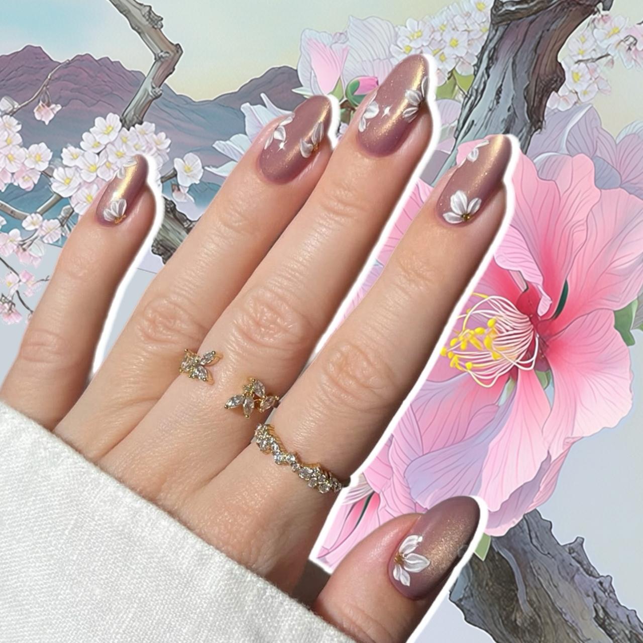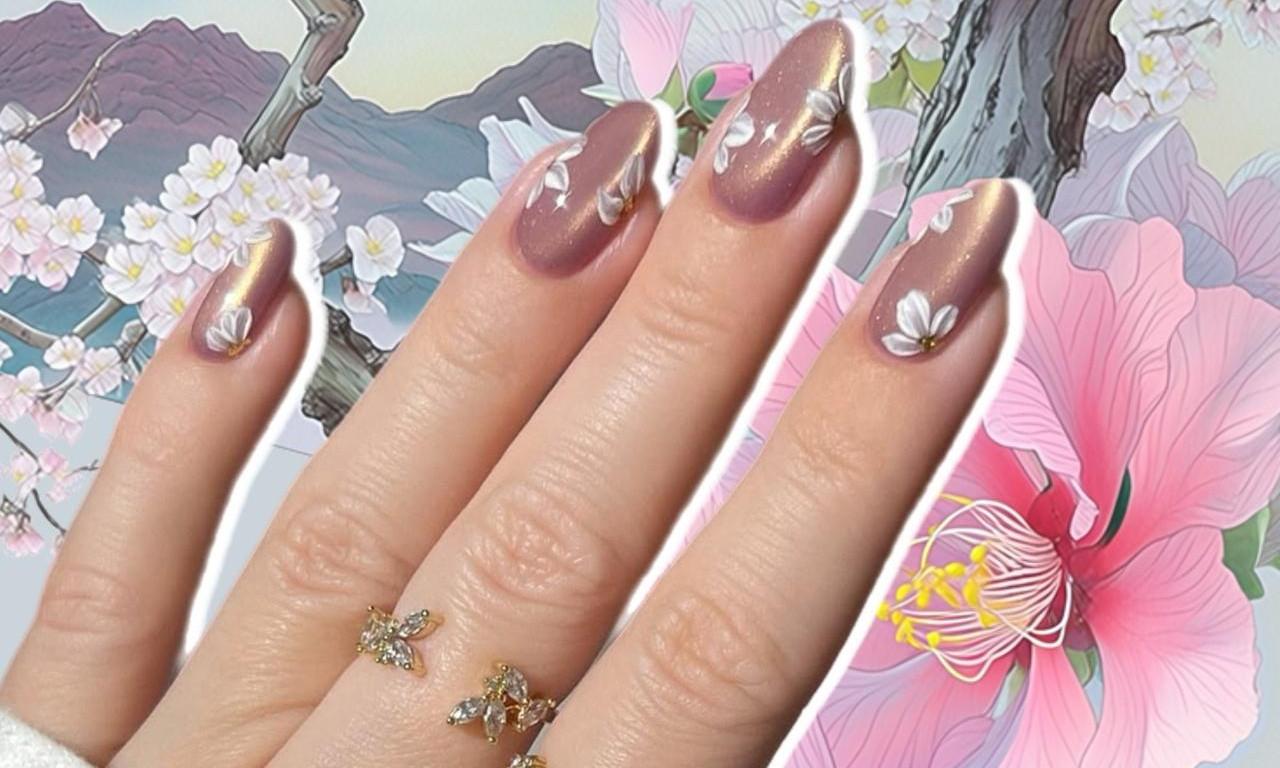 Если же хочешь сделать «кошачий глаз» главным героем своего маникюра, то покрой им один ноготь, а на остальных используй его для френча. Получится очень эффектно! Только не забудь создать правильный блик: води магнитом со всех сторон, чтобы он получился в центре и сиял с любой точки. Объемные цветы и золотые акценты идеально дополнят маникюр.
