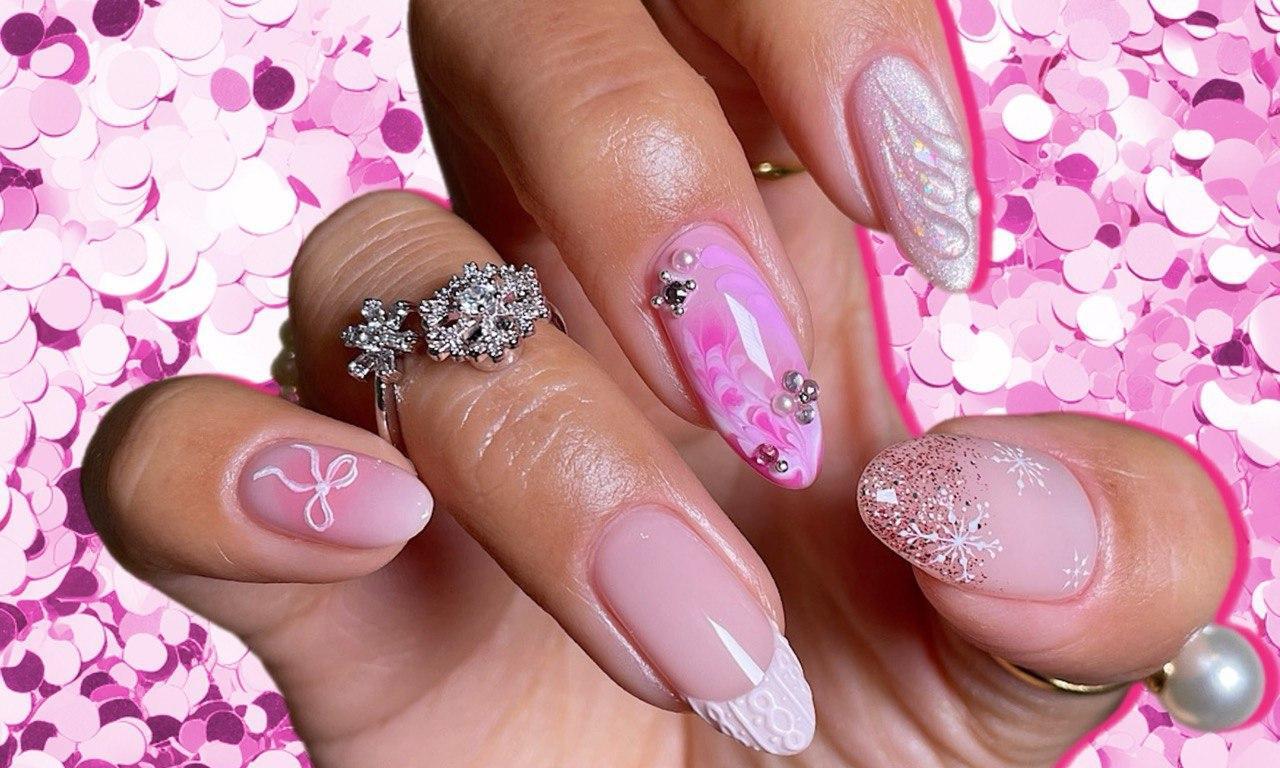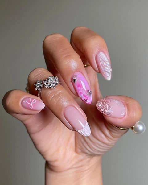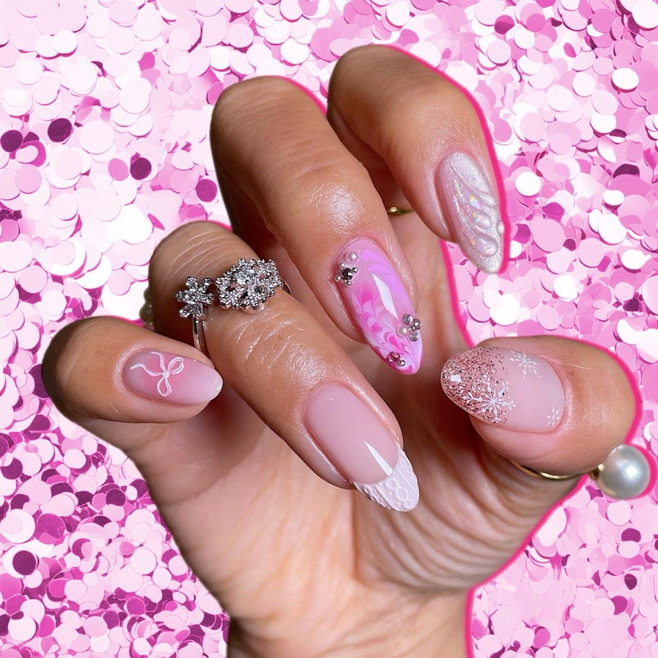 Кто сказал, что снежный маникюр обязательно должен быть белым? Особенно, когда существует многими любимый розовый — под любой образ и время года. Постарайся экспериментировать с дизайнами. Например, на большом пальце сделай яркое омбре с блестками и добавь к нему наклейки-снежинки. На указательном пальце продолжай делать акцент на сиянии втиркой в тон, добавив волны при помощи прозрачного 3D-геля. Ну и куда же без металлических акцентов и бантов.