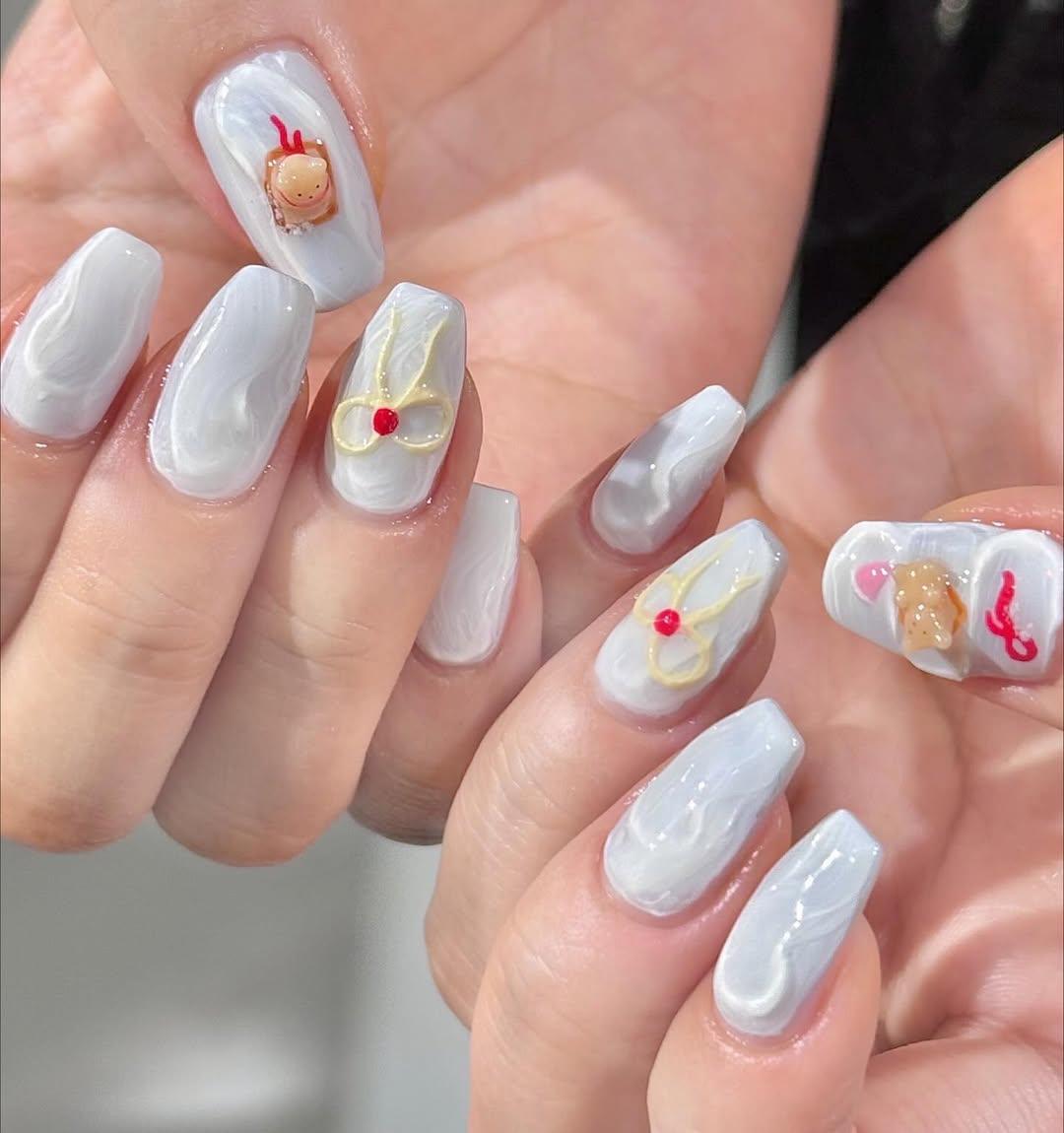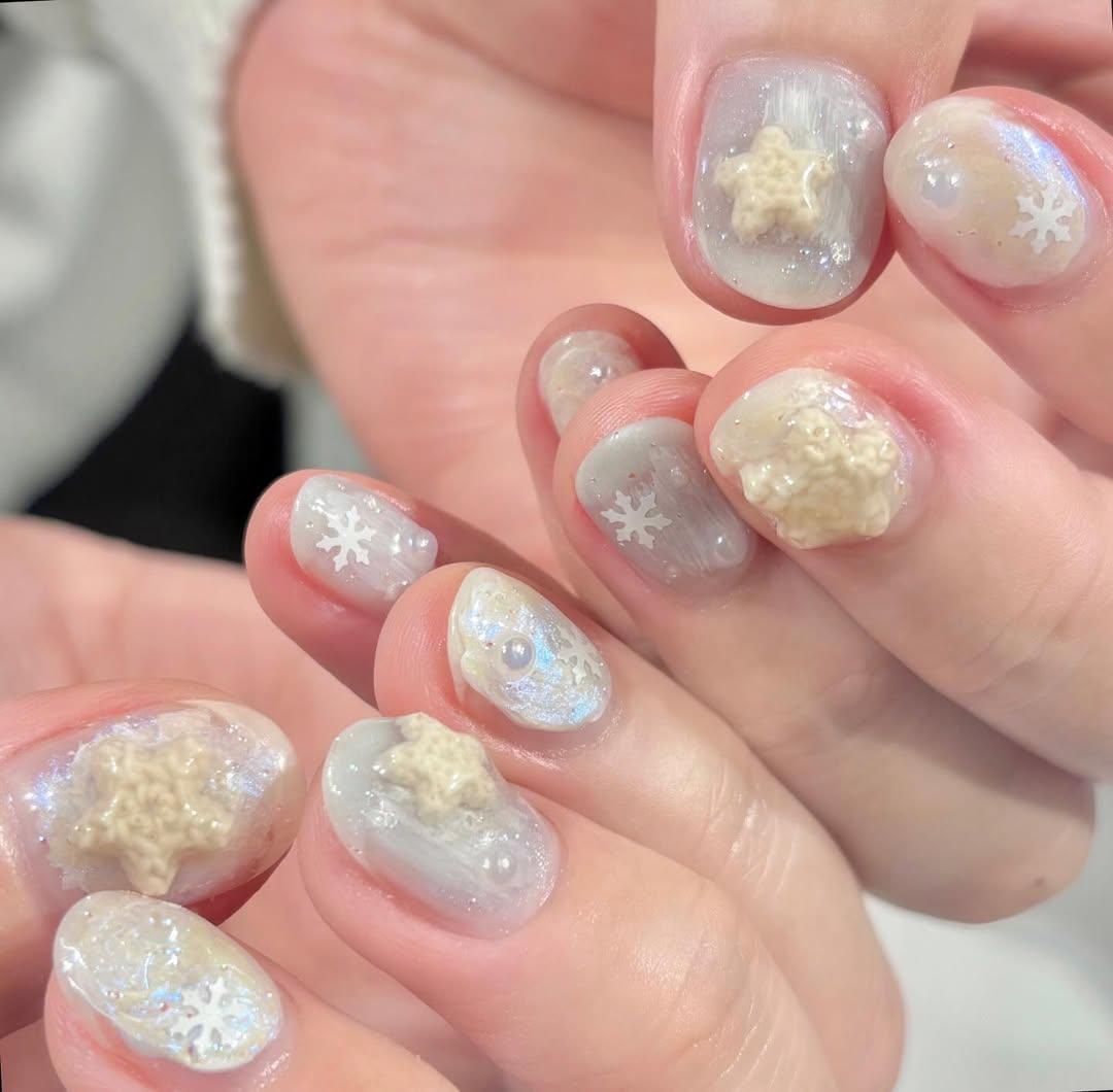 В детстве ты точно обожала кататься на санках со снежных горок… Корейские нейл-арты полны отсылок к детству. Например, маникюр с мишками, который станет отличной идеей с намеком на зимнюю эстетику. Чтобы добиться такого мягкого оттенка базы, замиксуй белый и голубой — выглядит как снег, покрытый инеем.