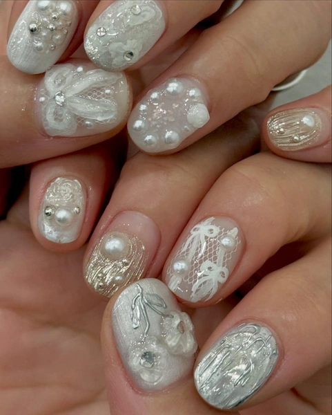 Самая популярная идея за последние несколько сезонов — маникюр с ассоциациями. Здесь ты можешь не только изобразить новогоднее настроение, но и добавить любимые акценты. К примеру, те же самые популярные банты, кружево и жемчуг. Последними тебе точно придется обзавестись: мастерить их из 3D-геля будет достаточно сложно. Главная фишка — абсолютно непохожие дизайны каждого ноготка. Один может напоминать ракушку, другой — подснежник, который только что распустился из-под тонны снега. В конце добавь несколько металлических элементов для большего сияния!