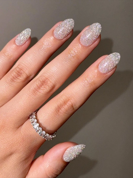 При упоминании о снеге, все мы сразу представляем невероятное сияние, особенно, когда на него падают лучи света. Я вдохновилась этой идеей и нашла для тебя максимально просто вариант. Как раз для тех, кто обожает минимализм: тебе понадобится обычный блестящий лак с достаточно крупным шиммером.