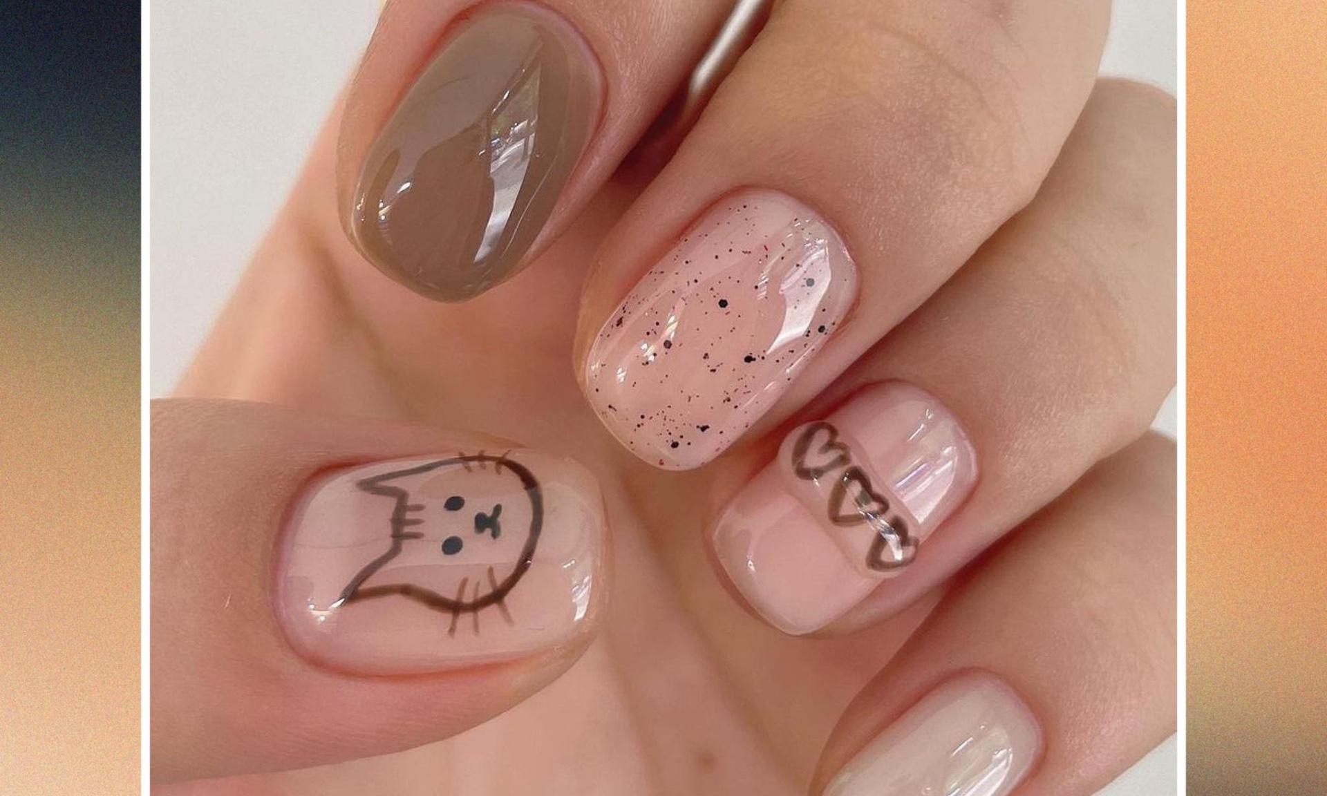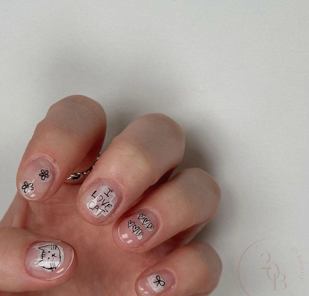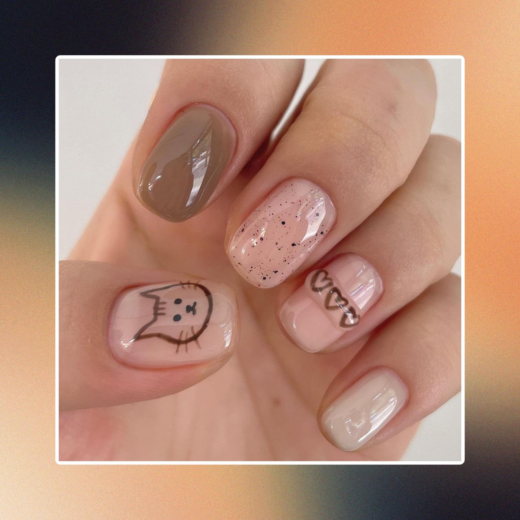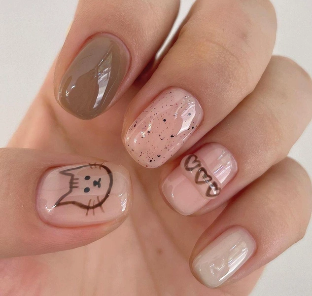В этом маникюре красиво сочетаются нюд и прикольный дизайн. Секрет в том, что использовать стоит нейтральные оттенки. Например, покрой все ногти молочным лаком, а один — коричневым. Нарисуй на одним пальце котика. Другие же укрась чем-то более привычным — втиркой, сердечками, топом в горошек.