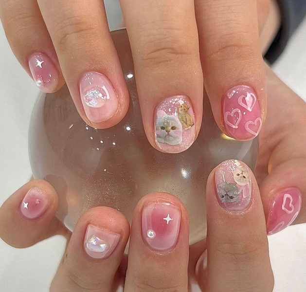 Если ты не умеешь или просто не любишь рисовать на ногтях, то слайдеры станут для тебя спасением. Это наклейки, но очень тоненькие, на водной основе. Они не отклеиваются и не дают толщины твоему покрытию, а вариантов слайдеров есть бессчетное множество. И котики в том числе, конечно. Так что на пару ноготков нанеси розовую базу с блестками и приклей смешных котят, а на остальных пальцах сделай другие разные узоры — ауру, сердечки, объемы, звезды, глиттер.
