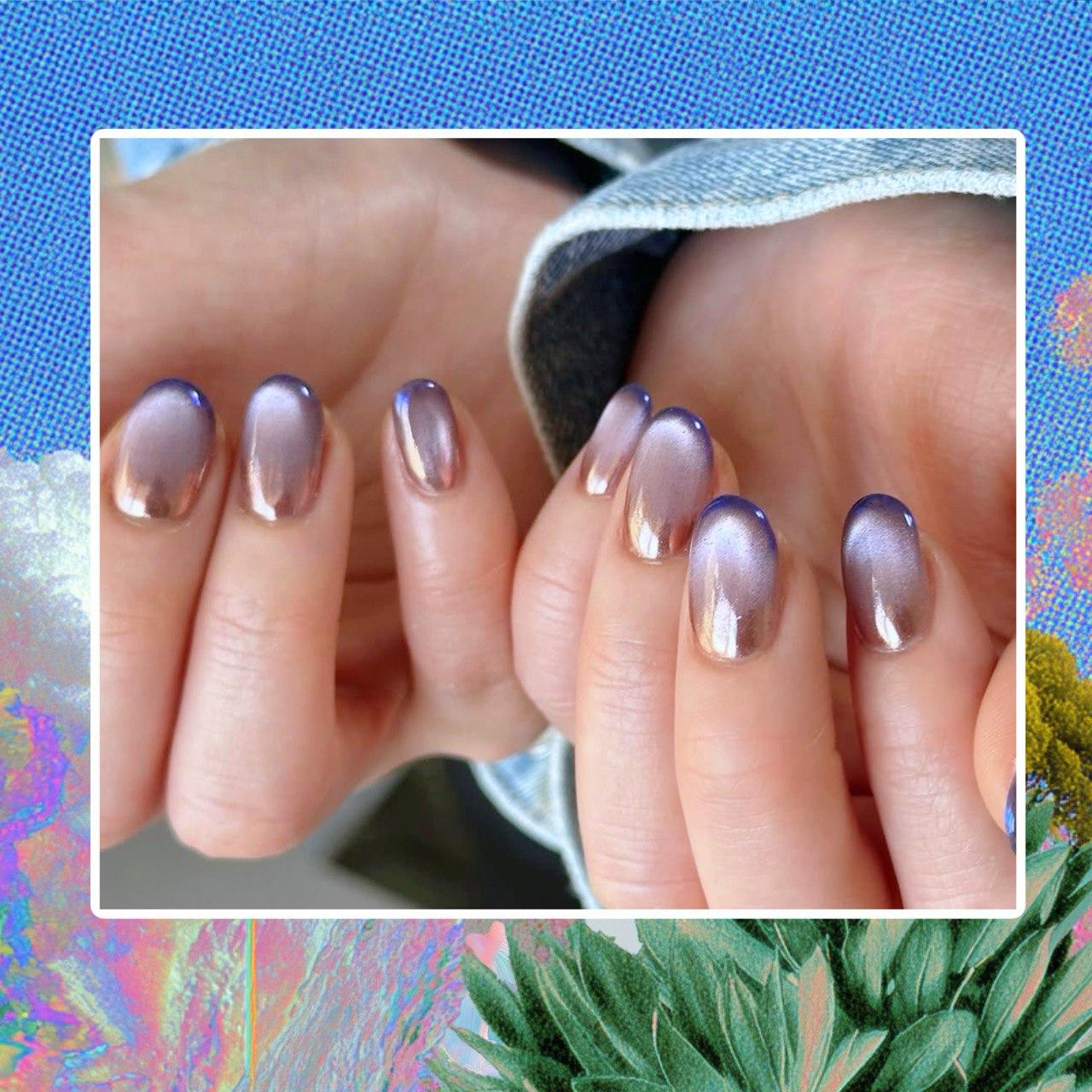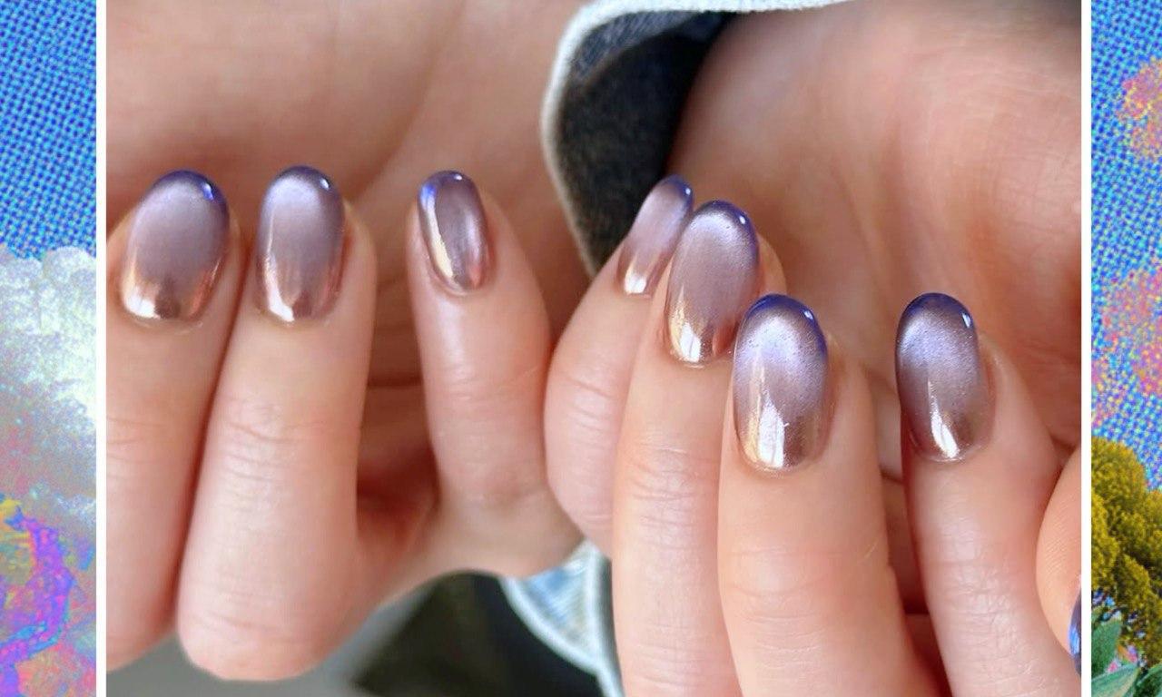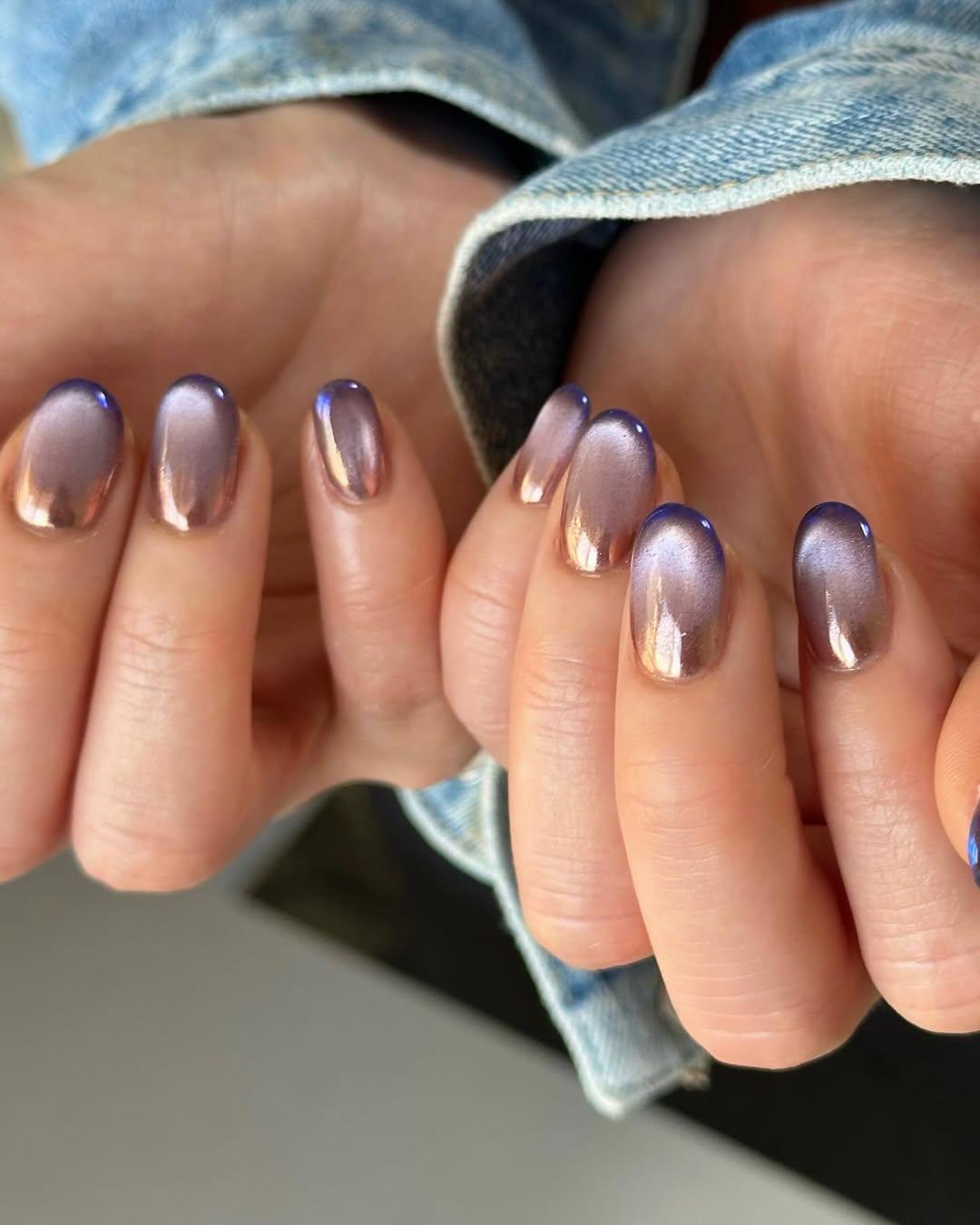 Плавный переход от бронзового блеска к нюдовому магнитному лаку делает ногти похожими на драгоценности. А тонкий сине-фиолетовый френч добавляет маникюру нотку технологичности и футуристичности.
